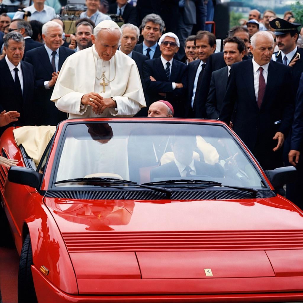 Pope John Paul II riding in a Ferrari Mondial Cabriolet during a visit to the Ferrari factory in Maranello, Italy (1988) [1024×1024]
