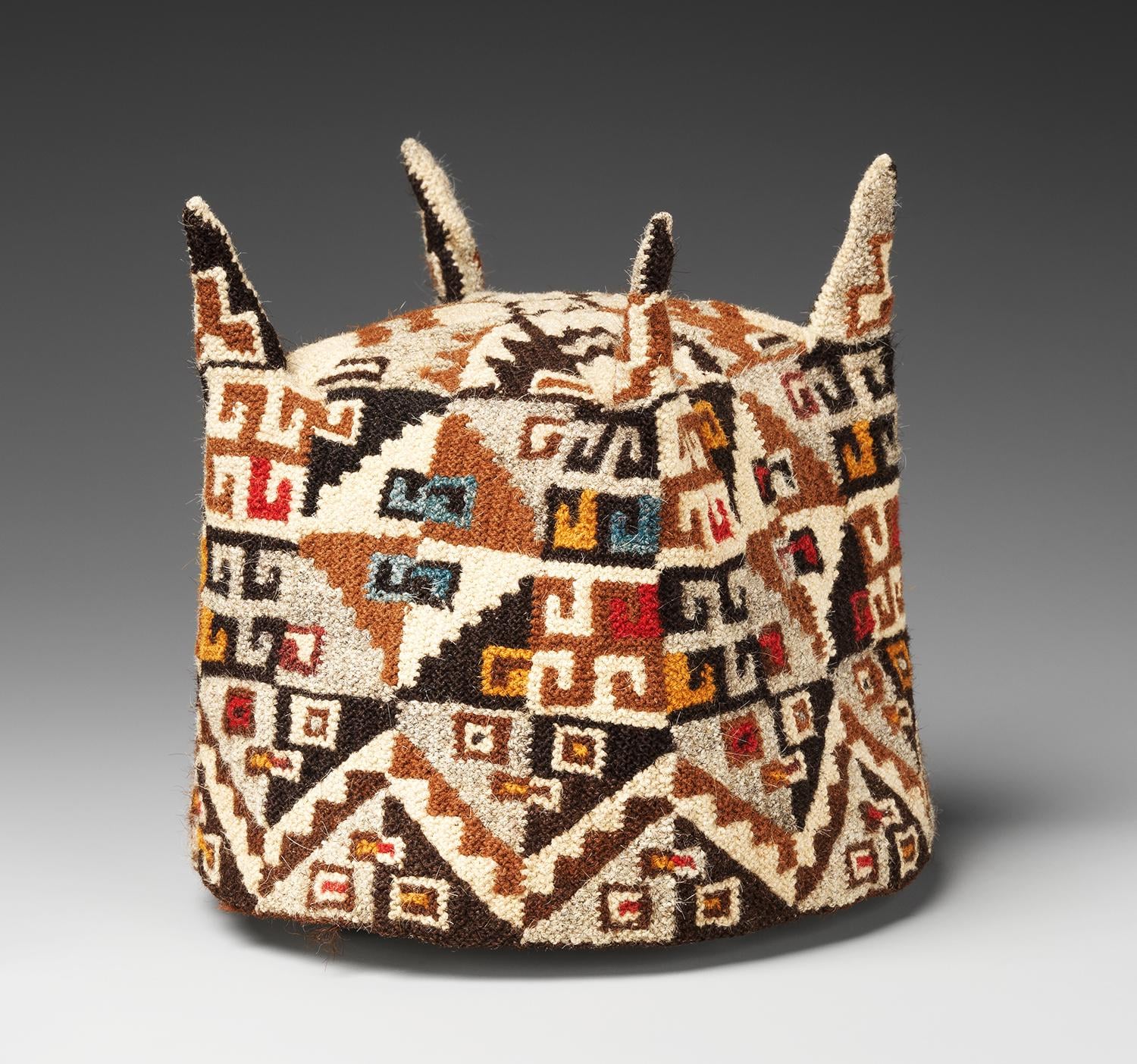 A four-cornered hat made from camelid fibers. 7th–9th century CE, Tiwanaku culture, probably from Bolivia, now housed at the Metropolitan Museum in New York [1500×1404]