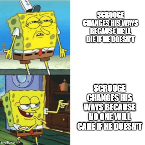 I don’t think a single person believed that Scrooge changed his ways because he dies. It’s inevitable and Dickens makes it very clear that no one will care if he dies. Dickens makes it a point to hide that Scrooge is dead to the very last reveal.
