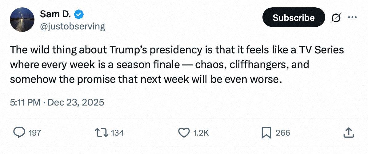 BreakImaginary1661 on December 24, 2025 5:15 pm The big difference is that his presidency delivers. Every week is even more fucked up than the last.