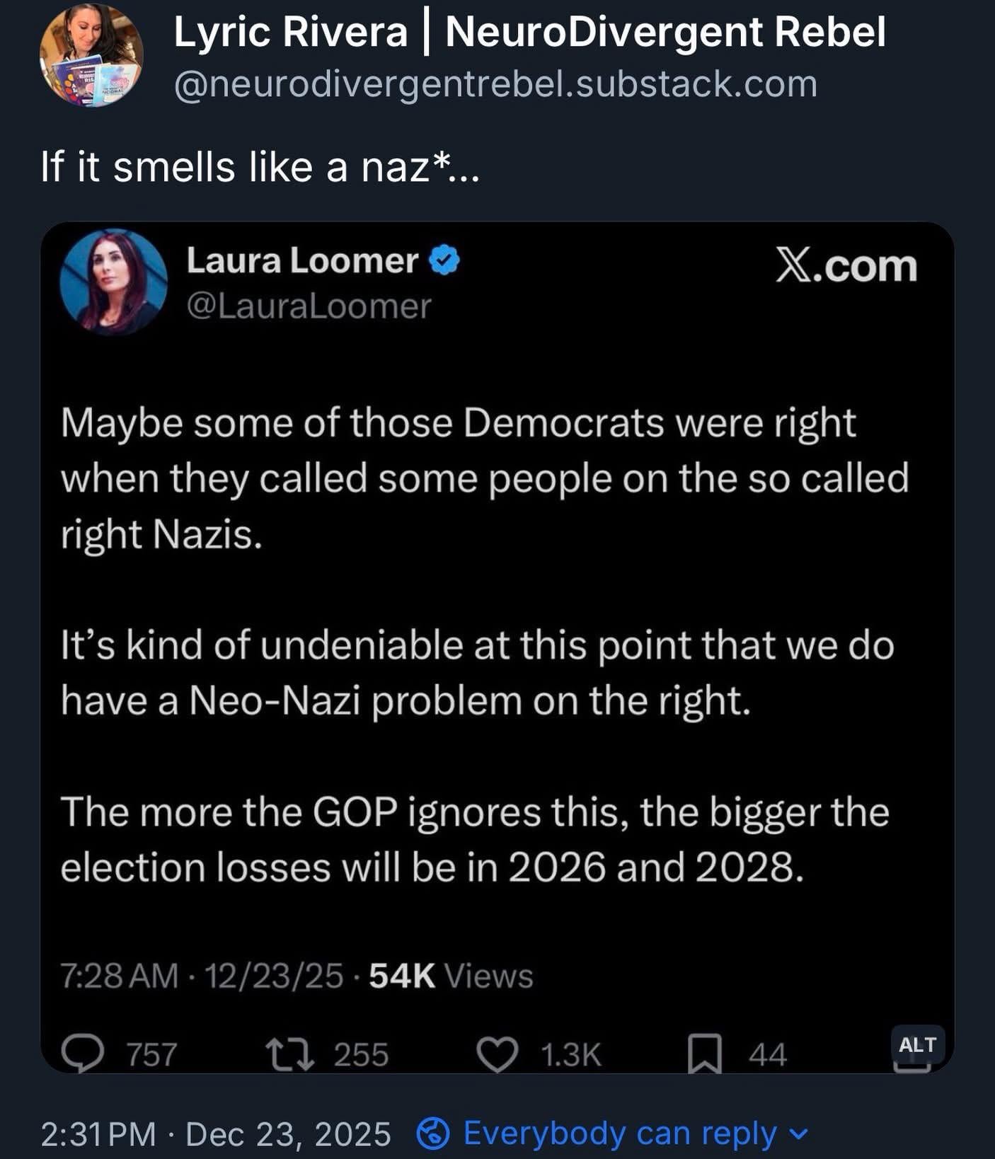 “It’s kind of undeniable at this point that we do have a Nazi problem on the Right. The more the GOP ignores this, the bigger the election losses will be in 2026 and 2028.”