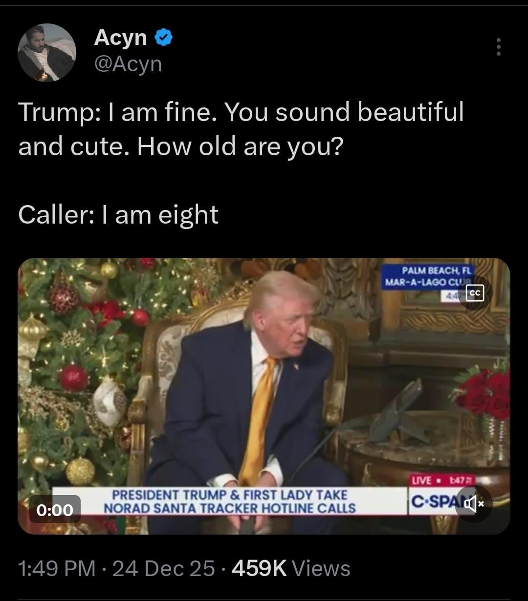 seeebiscuit on December 24, 2025 11:04 pm Trump has history with little girls and christmas. In 1992, he walked up to 2 14 yr olds in a choir outside the Plaza Hotel and told one of them he would be dating them in a couple of years. [Here is the Huffpost article on it ](https://www.huffpost.com/entry/donald-trump-14-year-old-girls_n_58003838e4b0e8c198a74748?section=us_politics). But there are many more that are easily searchable.