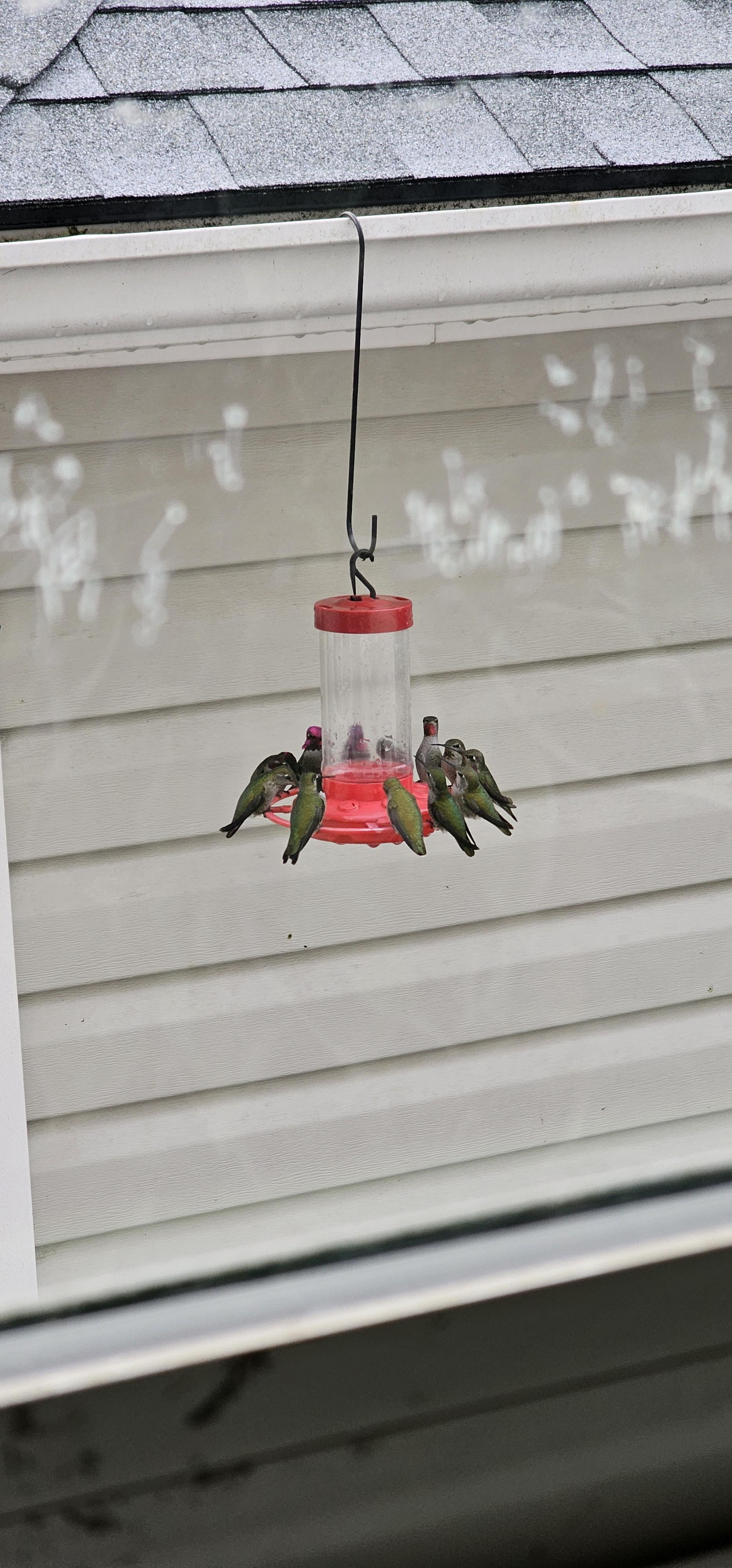I get mostly Anna’s hummingbirds at my feeder. This time of year is chilly so I hooked up one of those Hummerhearth gadgets that warm the nectar with a small lightbulb.