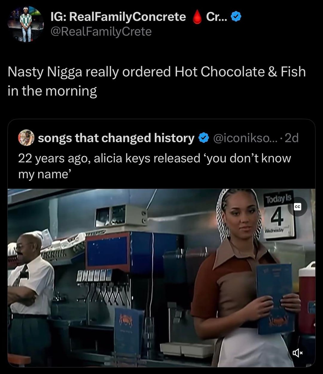 Hot chocolate AND fish before noon is a federal offense. Alicia Keys didn’t sing for this kind of chaos.