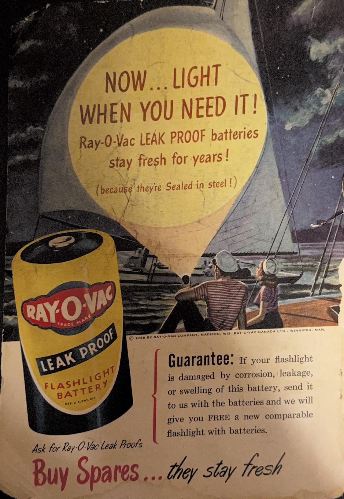 The gifts are bought and wrapped. Under the tree. In the stockings. Christmas morning is a few hours away. Sure hope you remembered to get batteries! Inside cover of Popular Mechanics August 1948 issue. by Defiant_Print_2114