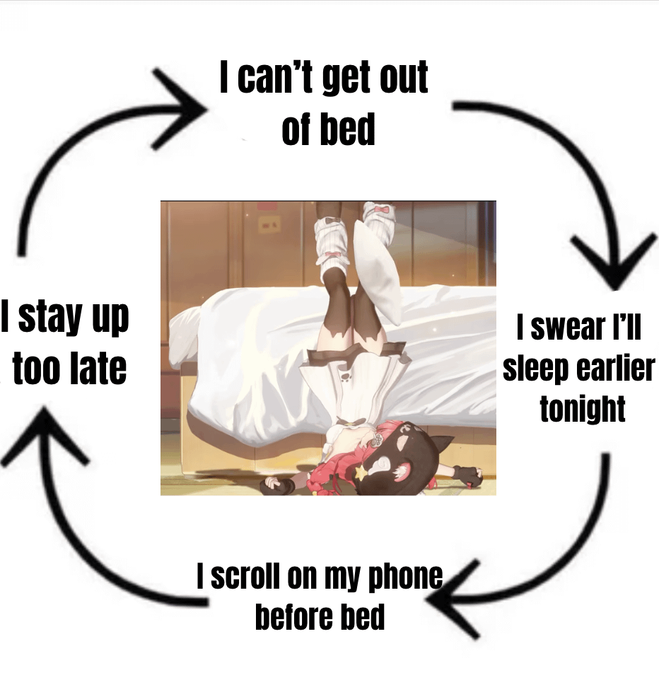 It goes more like….Get up….work till midnight… Eat…scroll….look at the clock saying 4am….suffer