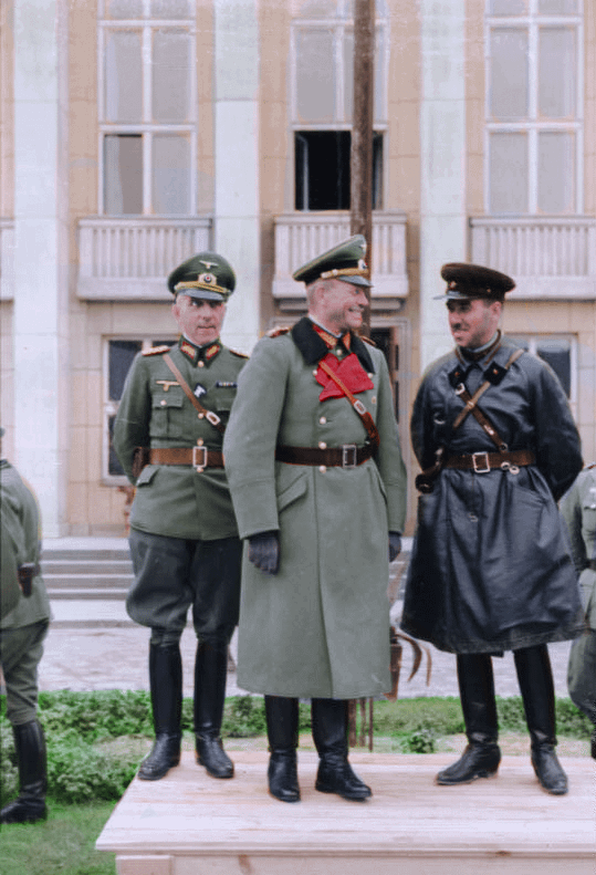German General Heinz Guderian sharing a laugh with Soviet General Semyon Krivoshein (who was also Jewish) during the German–Soviet military parade in Brest-Litovsk on September 22, 1939.[Colorized] [539×791]