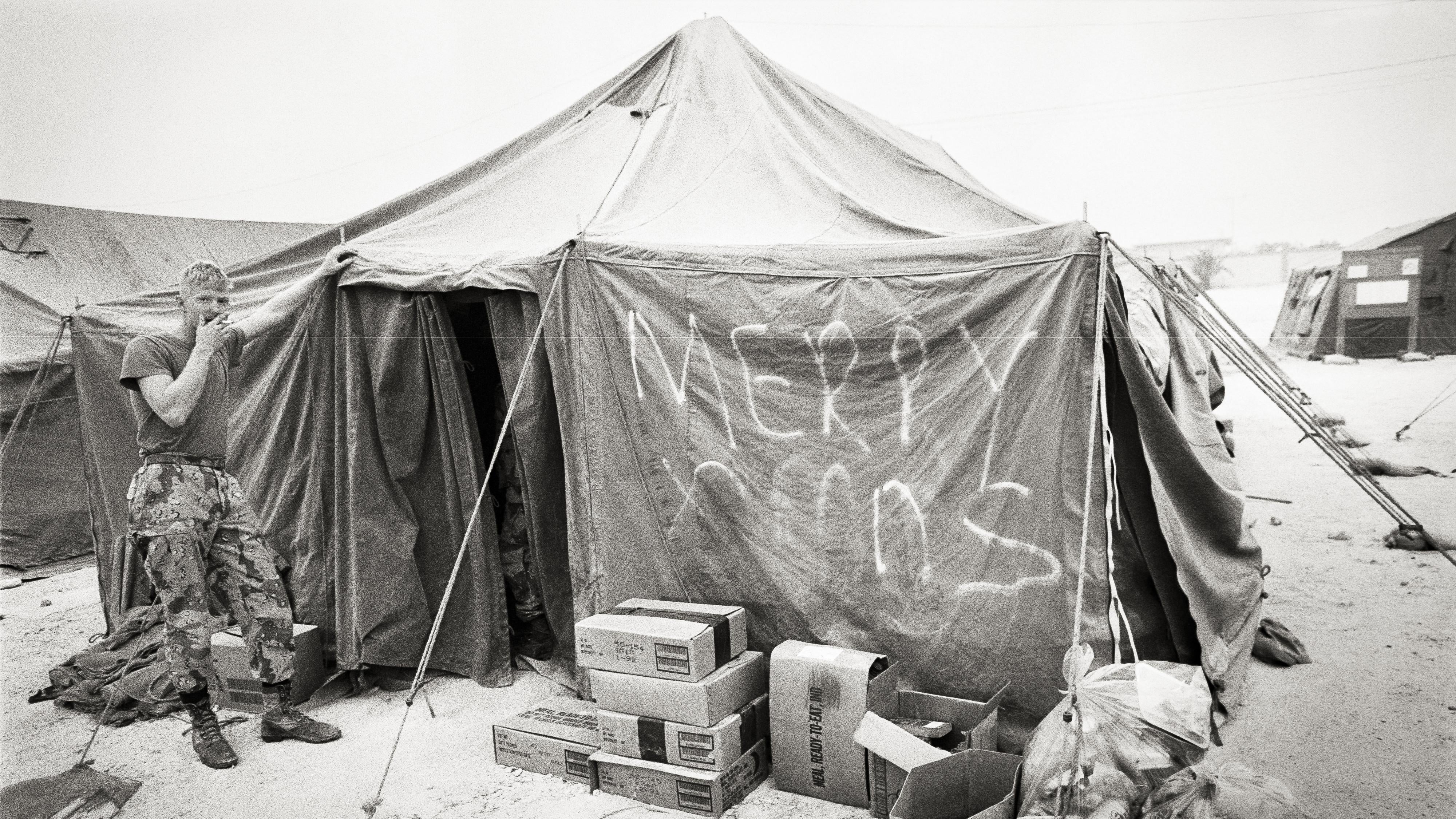 A paratrooper from the 313th MI Bn, 82nd Airborne at Camp Red, Abqaiq, Saudi Arabia on Christmas during Operation Desert Shield. He went on to earn a Bronze Start during Desert Storm for actions against the enemy.