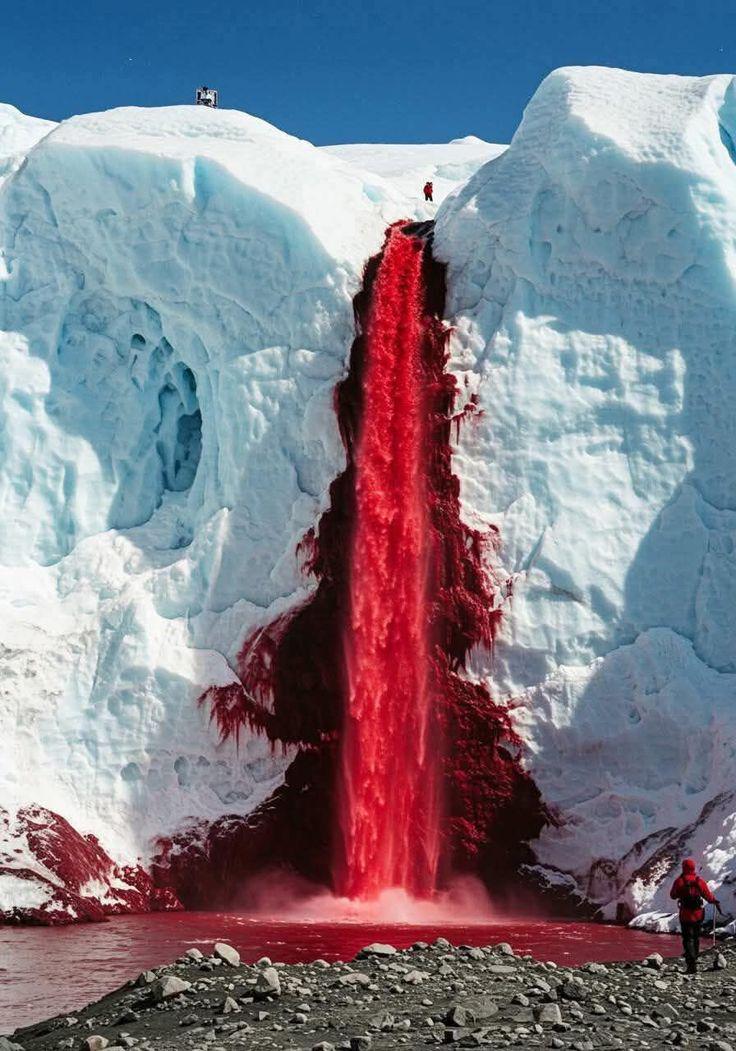This is a faked photo! Blood falls does actually exist but the colour is more brown like how blood looks when it’s old; it’s NOT BRIGHT RED! I learned about those falls on a YouTube video from a channel of a scientist working in Antarctica. The scientist debunk the myth of how these falls really look by taking a helicopter out and showing everyone how they really look. He said how many fake pictures and videos exist of this place and he wanted to set things straight!
