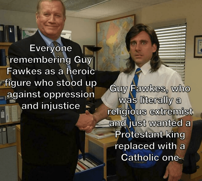 “How dare Guy Fawkes try to kill the king and establish a theocracy!!!”