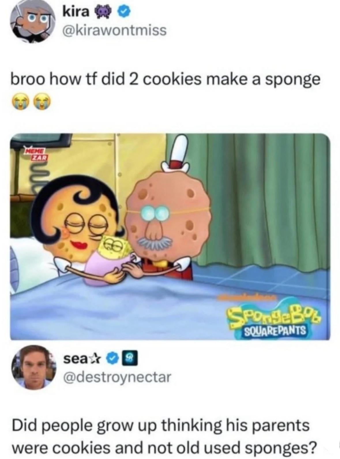 MediocreSocialite on December 26, 2025 12:07 pm Pictures like this also remind me that I overthink everything and need to chill out SpongeBob shows the recessive gene of his family. Majority of the family are round but while SpongeBob and Stanley are square SpongeBob and Stanley are the odd ones out of their family in behaviour, personality and looks. Which they both match eachother