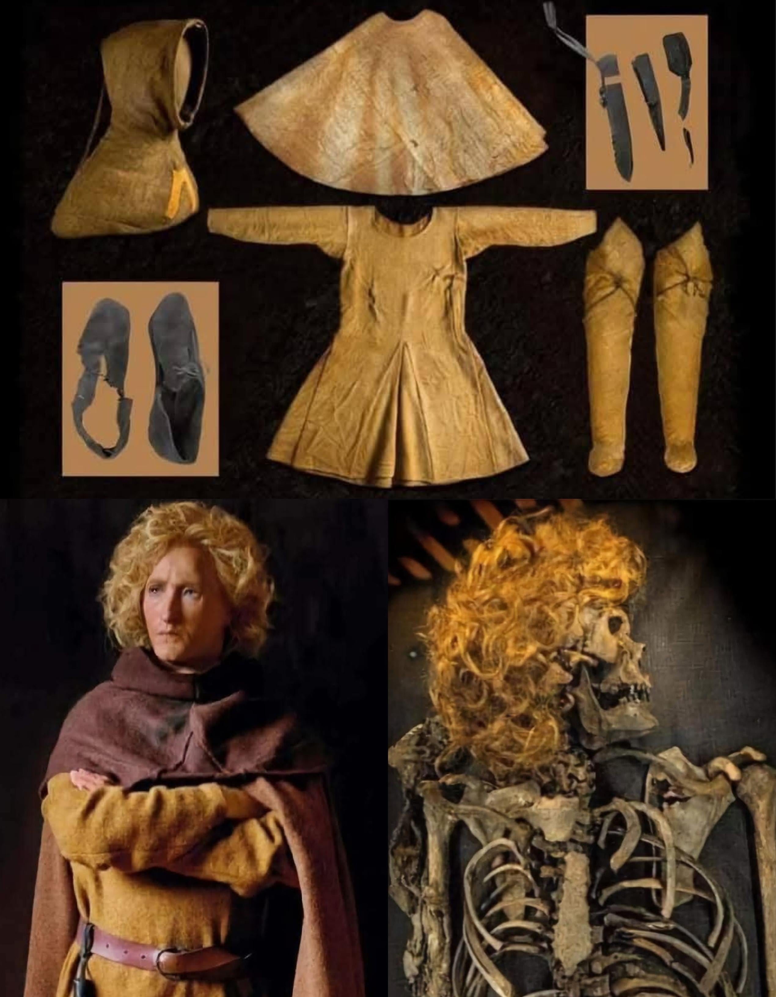 The Bocksten Man, 14th Century CE. Found in a bog in Sweden, fully dressed, and had well preserved hair. The garments, having survived over 600 years, include tunic with cloak & hood, shoes andleg coverings, and a knife type object withstrap/belt. [900×600]