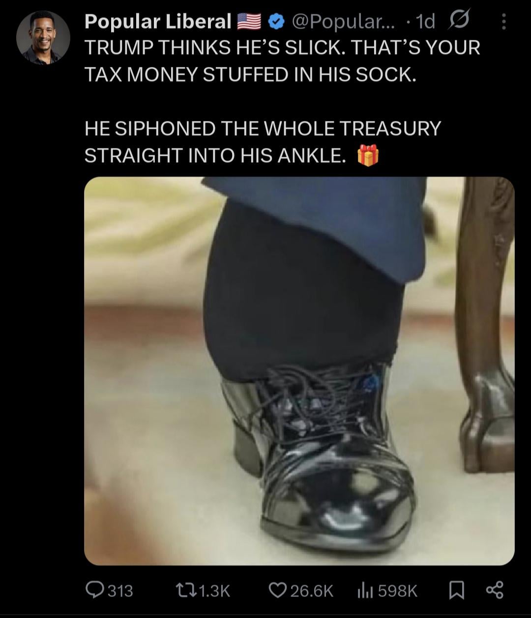 TRUMP THINKS HE’S SLICK. THAT’S YOUR TAX MONEY STUFFED IN HIS SOCK. HE SIPHONED THE WHOLE TREASURY STRAIGHT INTO HIS ANKLE.