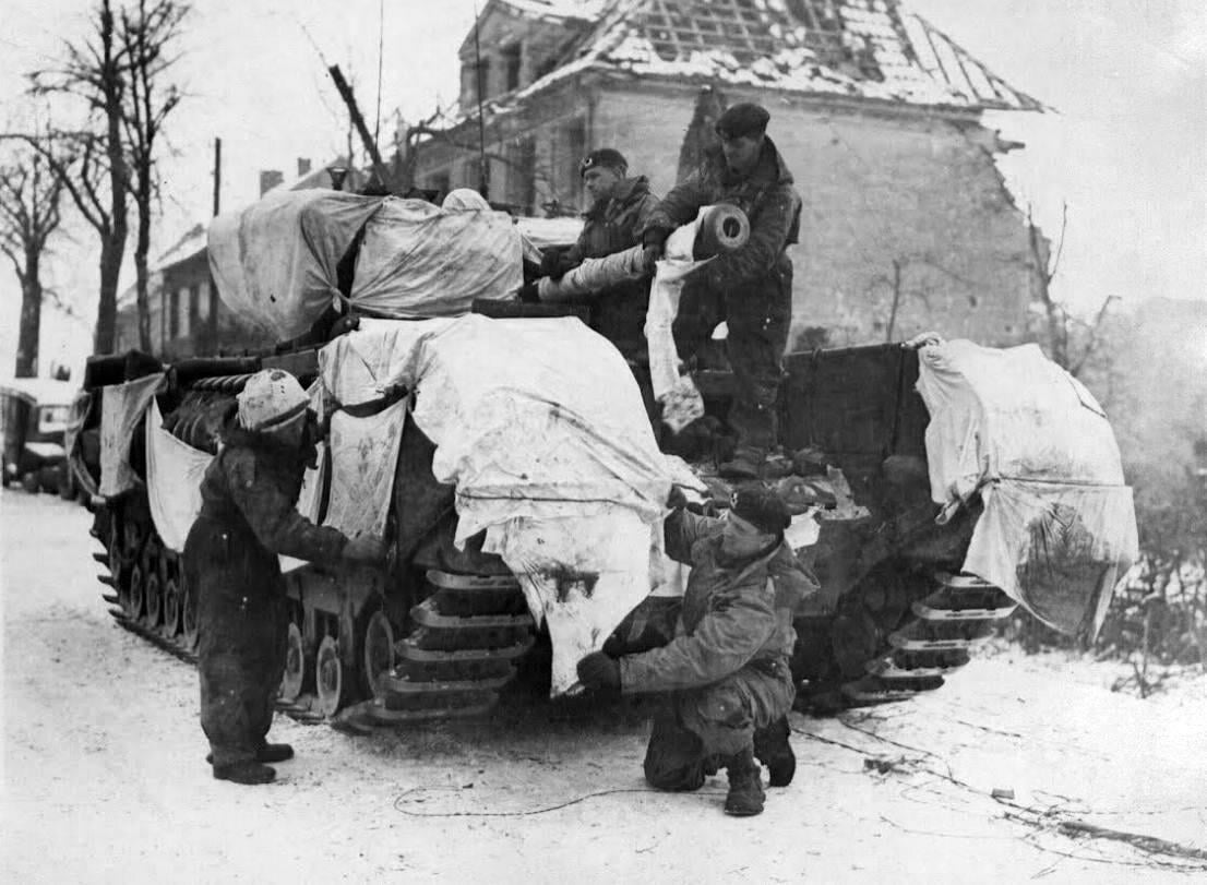 Tankers applying bed sheets on their Churchill tank for snow camouflage, c. late 1944 to early 1945 [1,106×811] by UpperphonnyII