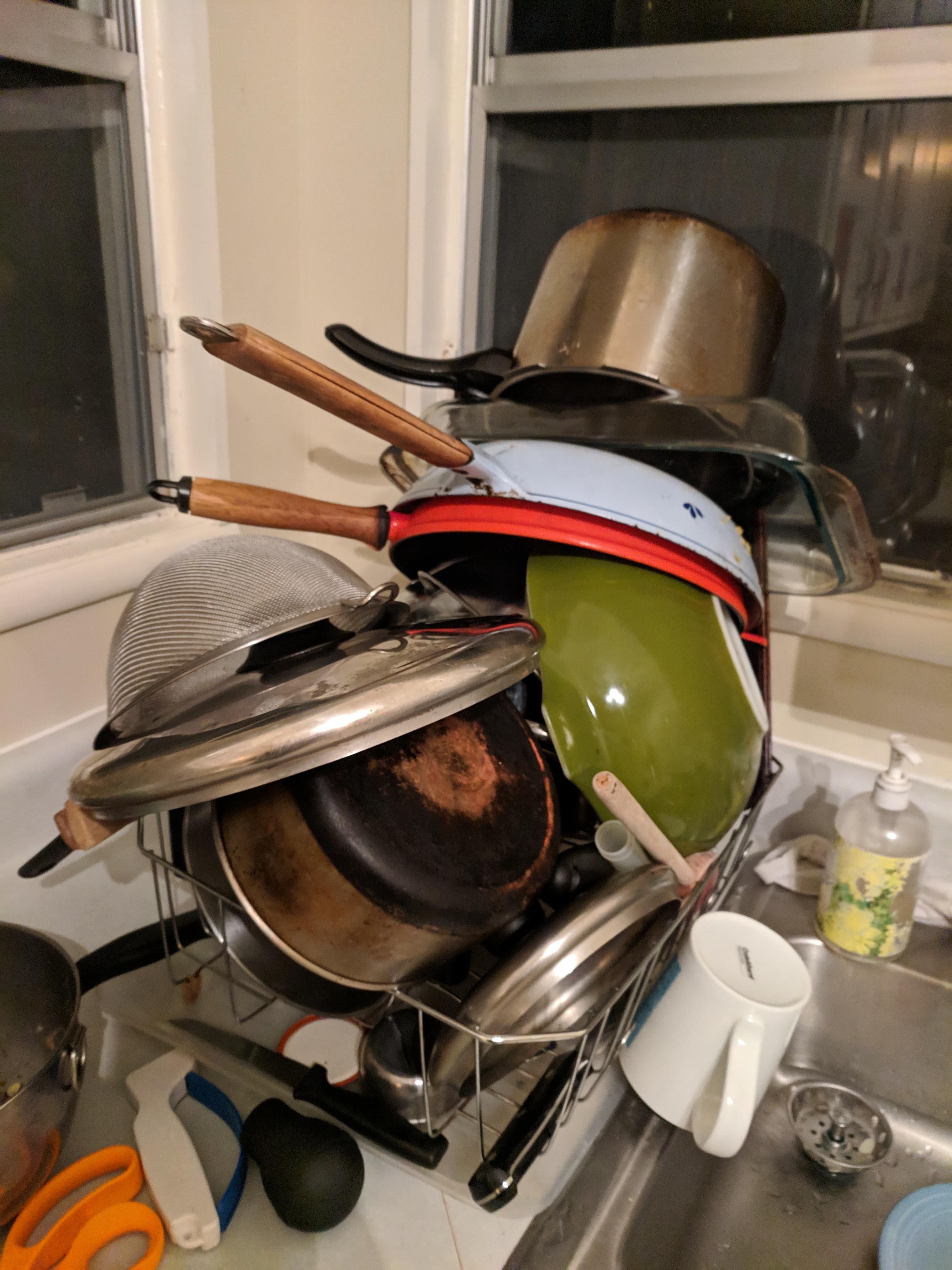 Not sure I would be stacking that glass container like that, not to mention the coffee cup hanging on for dear life there, the pan nested on top of the other pan might not dry, all while their buddy is shoved down at the bottom of the stack. So not sure I would call this art, unless it’s titled “Look how *****y I can stack things”