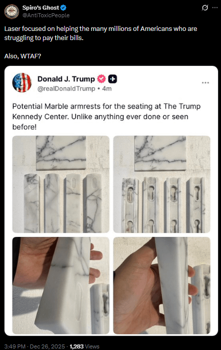 No healthcare for millions but no problem…this evil asshole has marble armrests for the place no decent person wants to go since he slapped his name on the building