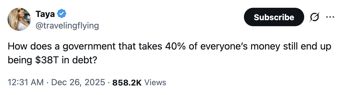 People think they’re taxed to death, but we’re in one of the lowest tax environments since the early 1900s. The government is on debt because we keep cutting taxes without cutting spending.