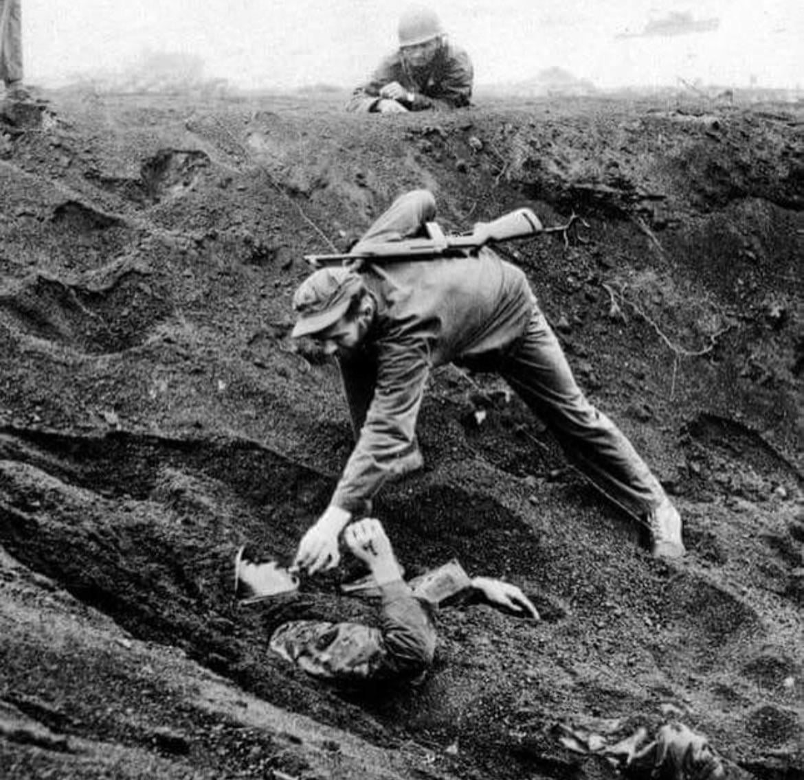 This Japanese soldier was buried for 1 1/2 days in a shell hole, playing dead and ready with a live grenade inches away from his hand. After the Marines knocked the grenade to the bottom of the shell hole, they feared he might be further booby trapped underneath his body. So promising no resistance, the prisoner is given a cigarette that he asked for and was dragged free from the hole.