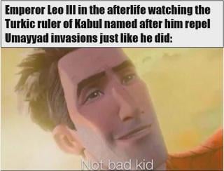 Context: In the 8th century, the Umayyad Caliphate attempted to expand deep into regions of what is now Afghanistan. Tegin Shah, the ruler of one of the independent principalities around what is now Kabul known as the “Turk Shahis”, was one of the rulers to face the might of the Umayyad. At some point after 717AD, Tegin Shah received news of the Umayyad military disaster inflicted by the Roman/Bulgars at Constantinople, and was apparently so impressed that he named his son “Rome Caesar” in honour of Leo III for his victory against their common foe. “Rome Caesar” (transcripted as Fromo Kesaro) would later succeed his father as the ruler of Kabul, and during his reign Fromo Kesaro successfully defended his realm from Umayyad incursions, just like his namesake had done.