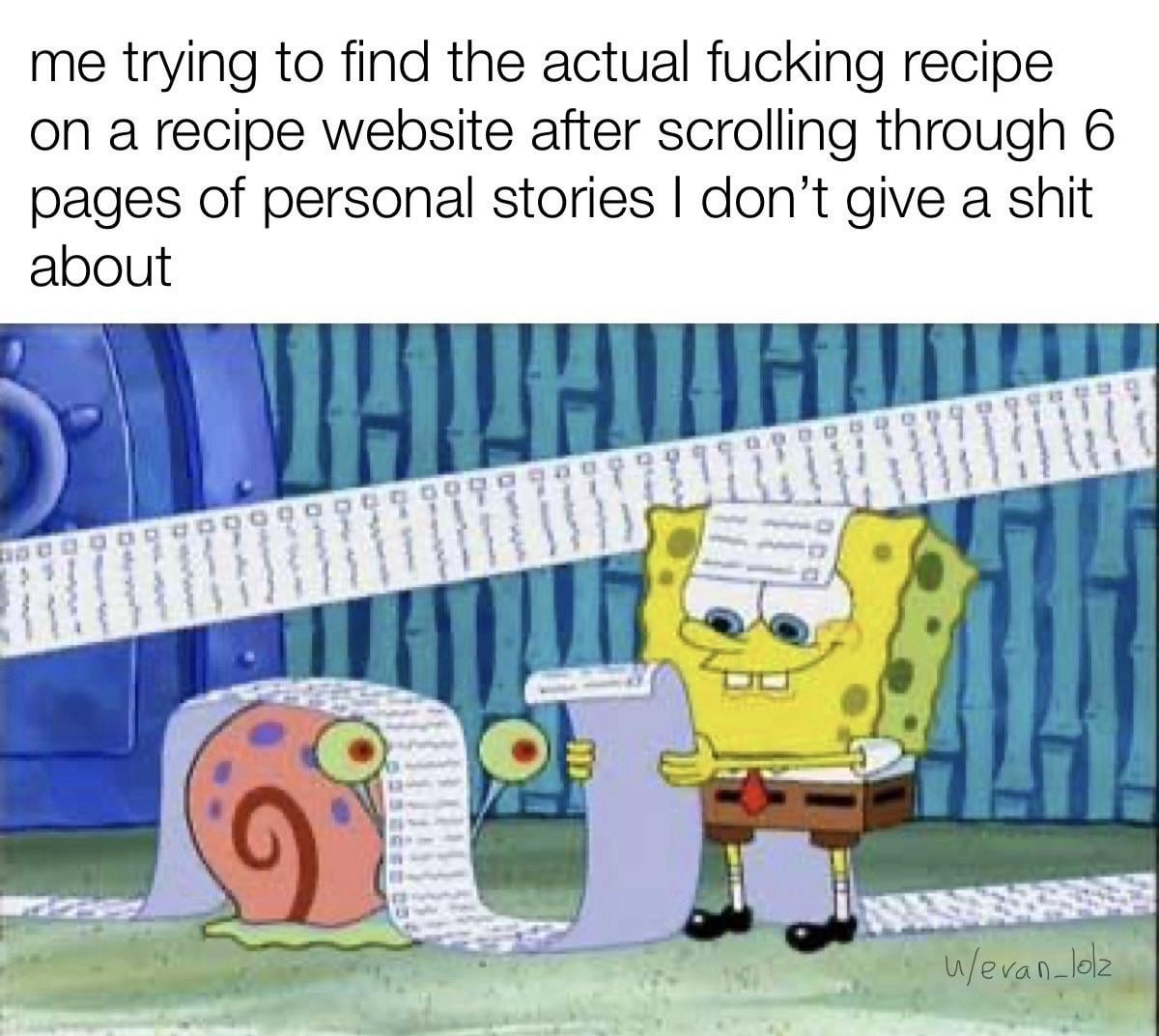 It’s like 56 anecdotes, then the recipe, and then 100 comments asking if eggs and flour can be changed for something else cuz someone has a gluten intolerance