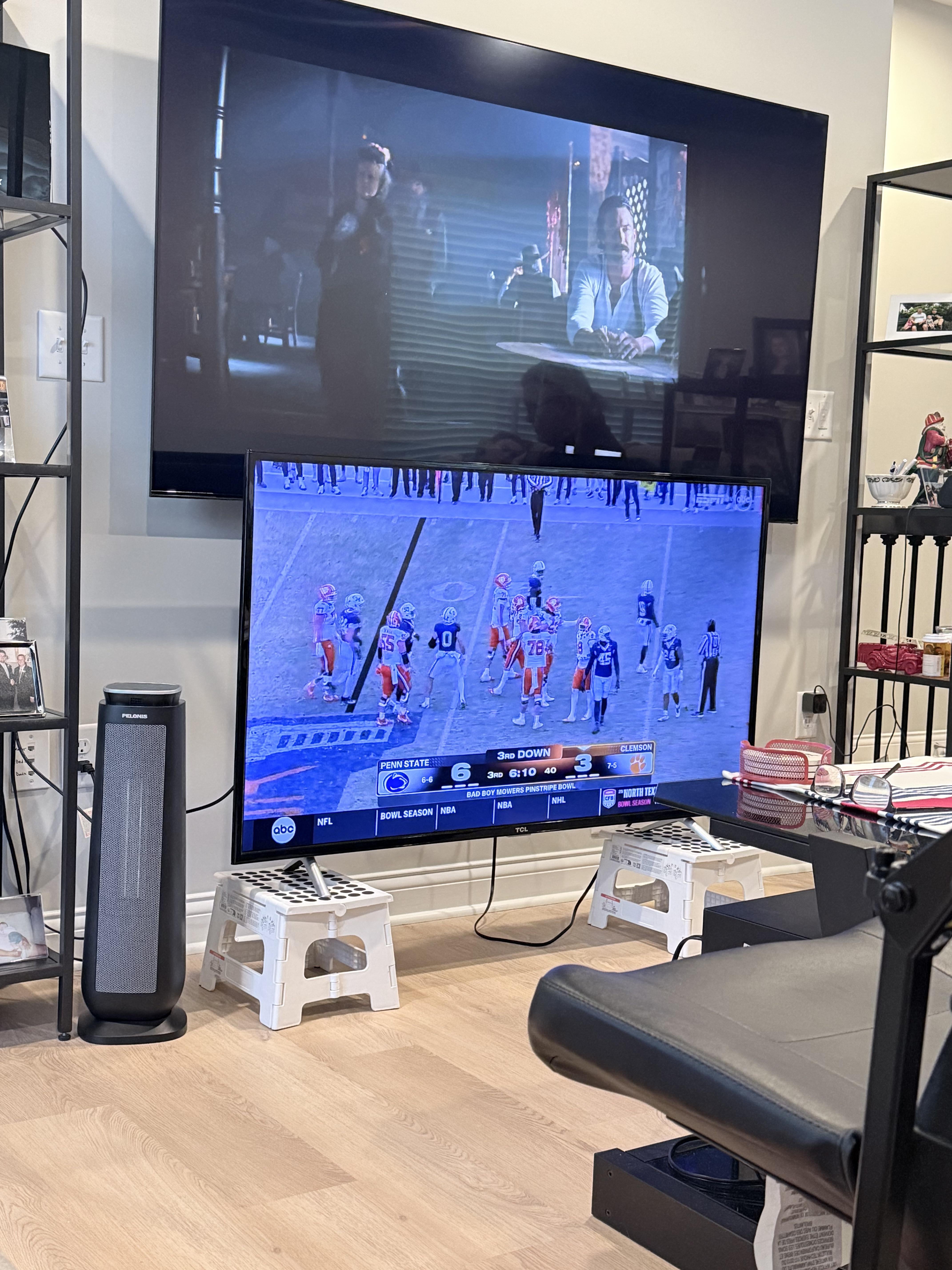 Mine are permanently mounted 65″ and 75″. It comes in handy during college football or overlaps with baseball and hockey. Watching the Wasabi bowl and Bad Boy mower bowl on them now.