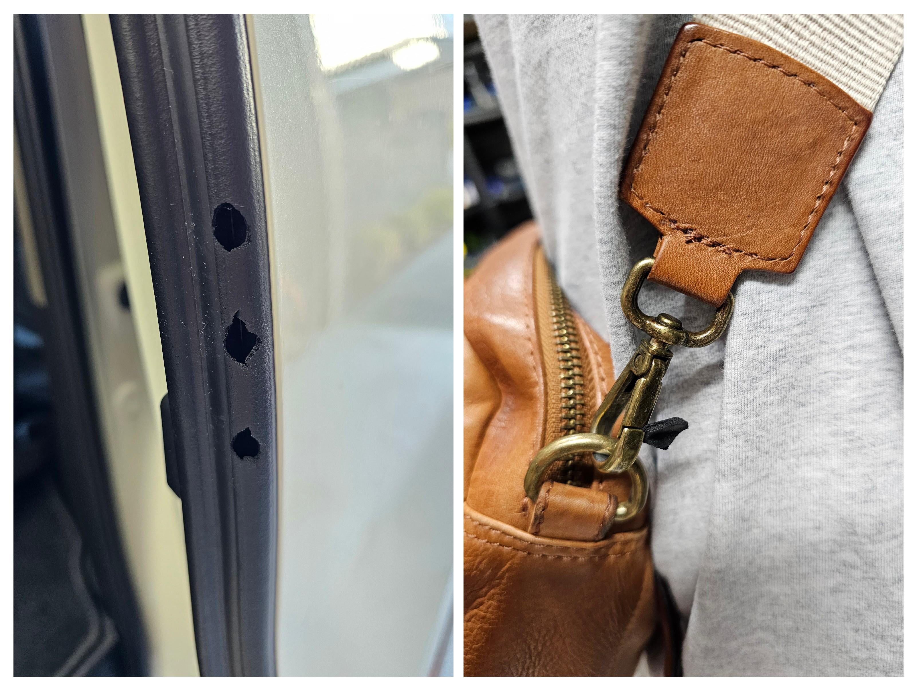 My wife and I first noticed 2 holes in our car’s rubber seal a few months ago. Yesterday a 3rd hole appeared. It wasn’t the kids, it wasn’t a mouse. Turns out it was my wife’s handbag hook catching onto the rubber while strapping our daughter into her seat – caught red-handed!