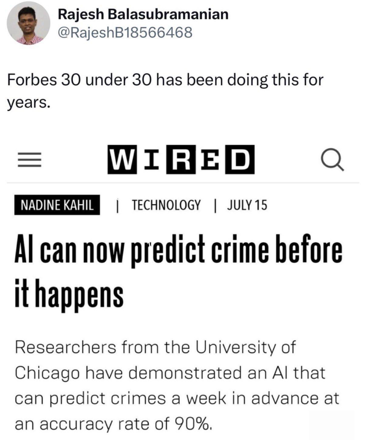 InShambles234 on December 28, 2025 9:15 am To people missing the joke, the Forbes 30 under 30 list is full of people who committed fraud. Also, AI absolutely can not predict future crime.
