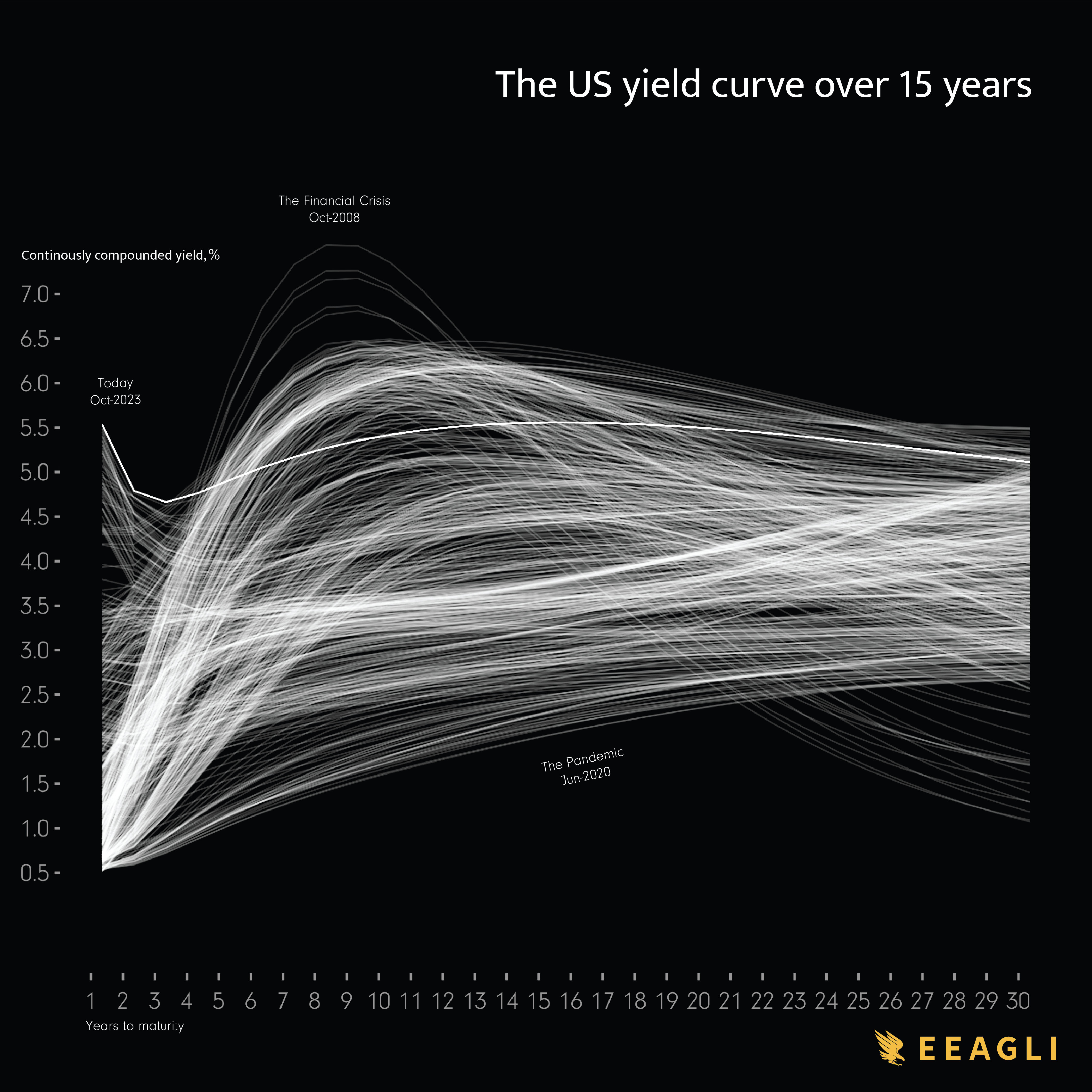 I created this using data taken from the US Federal Reserve. Each line represent the yield curve every 72 hours. I create the chart using d3 on a 4k screen.