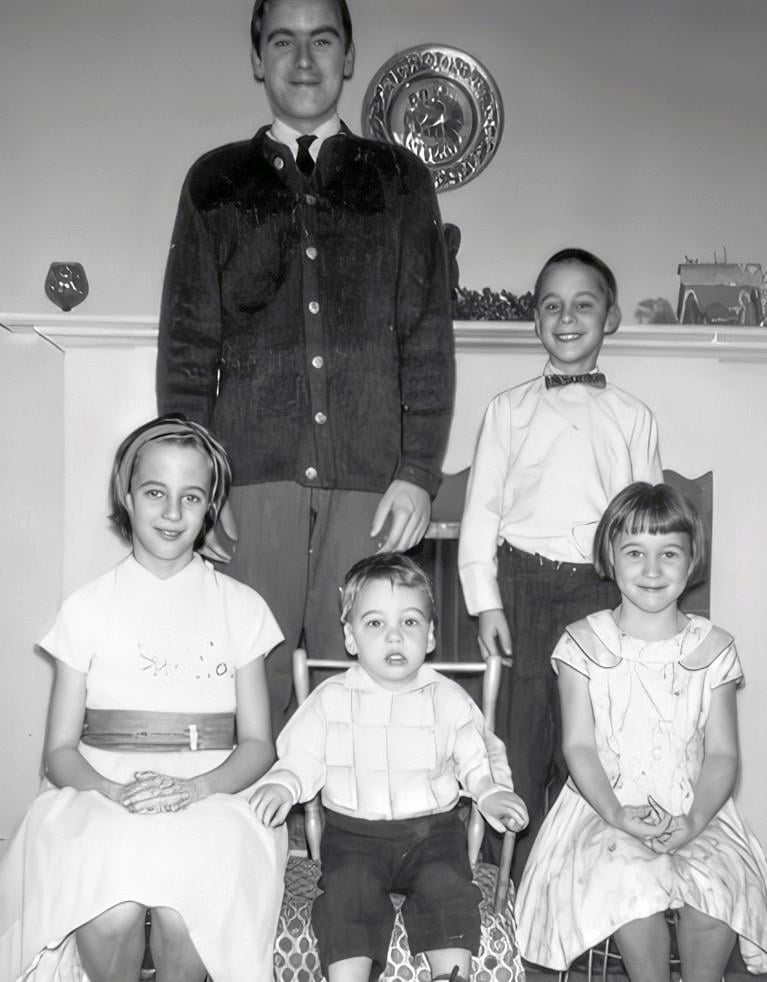 Ted Bundy, age sixteen, towers over his four half siblings in this photograph in Tacoma, circa 1963. By this point, he may already have committed his first murder. [767 x 982].