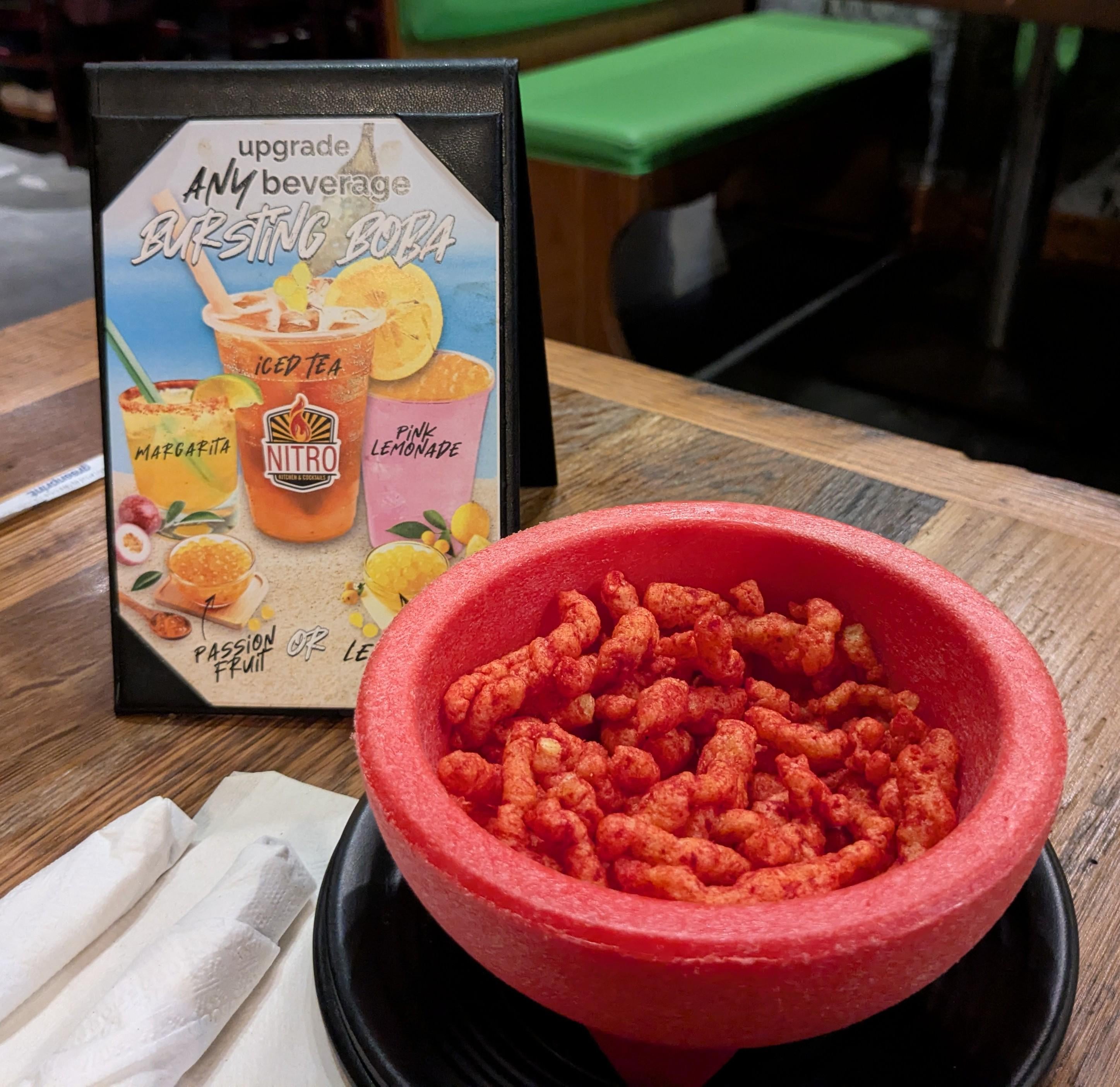 Instead of bread or chips, this restaurant brought out free Flamin’ Hot Cheetos before the meal