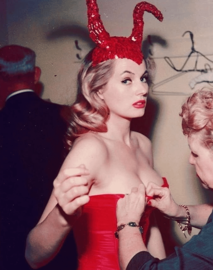 Anita Ekberg, the devil costume, perfect curls, those red lips. This is what 50s Hollywood glamour looked like at a party. Four years later, she’d become legendary in Fellini’s masterpiece