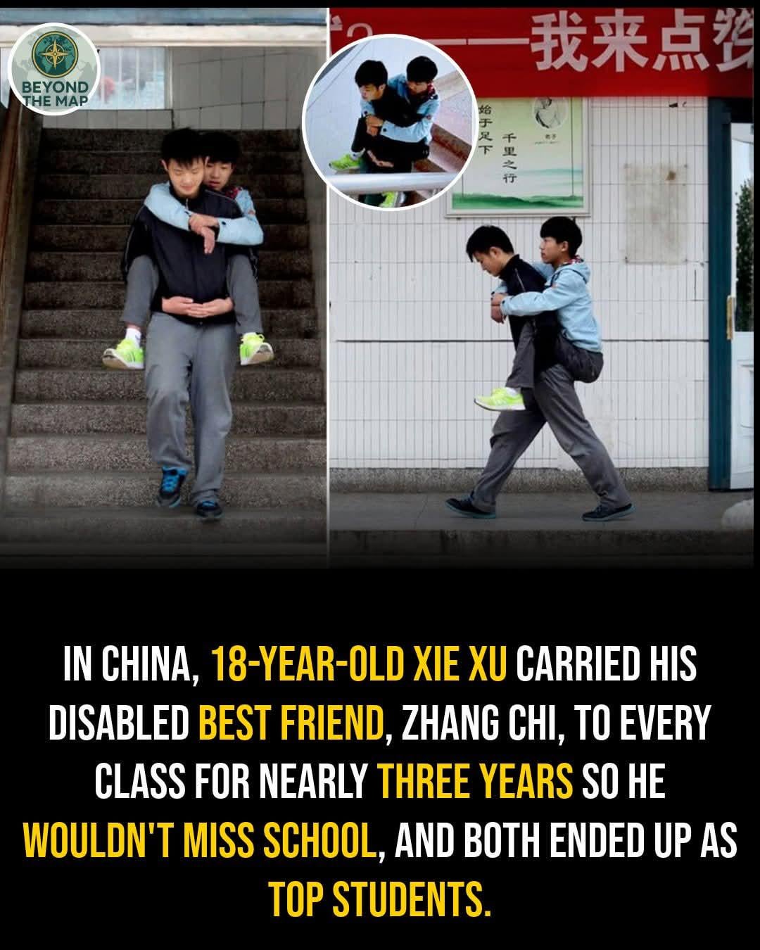 “The story of the two students is so inspiring and touching. They aren’t family, but [Xie] has been doing this for three years. He’s the most beautiful student,” said Guo Chunxi, the vice headmaster of Daxu High School told local media. “He also exerts positive influence on other students, who readily help Zhang. With their assistance, Zhang has never missed out on one single class.”