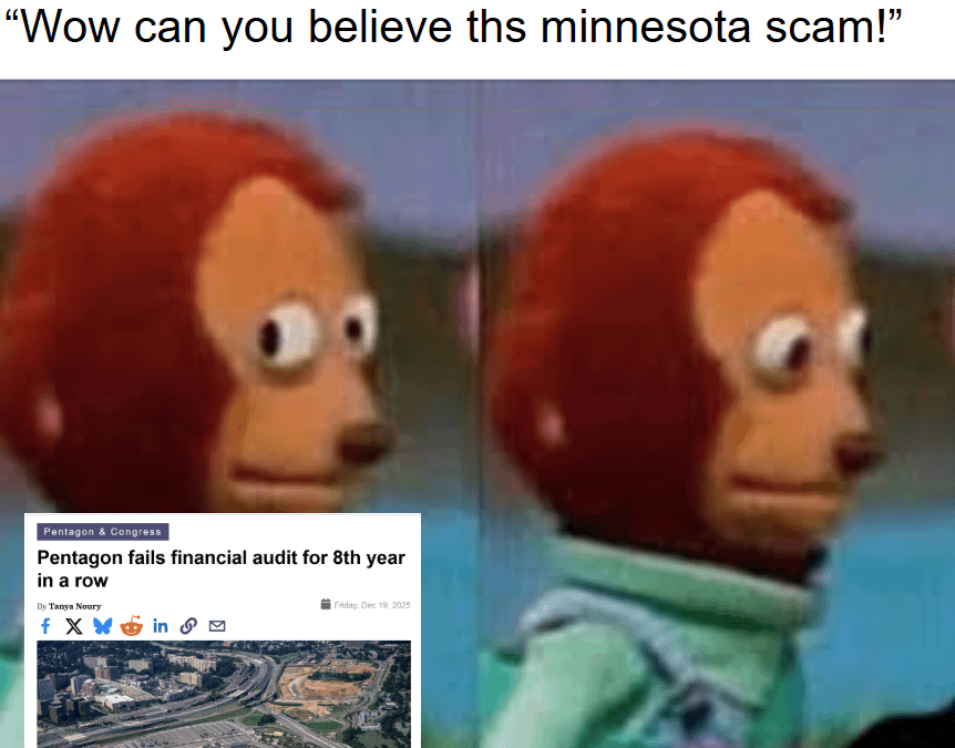 DerangedGinger on December 31, 2025 1:10 am It’s like shootings in Chicago. I expect the Pentagon to be up to some shit. I do not expect daycare scams I’m Minnesota.