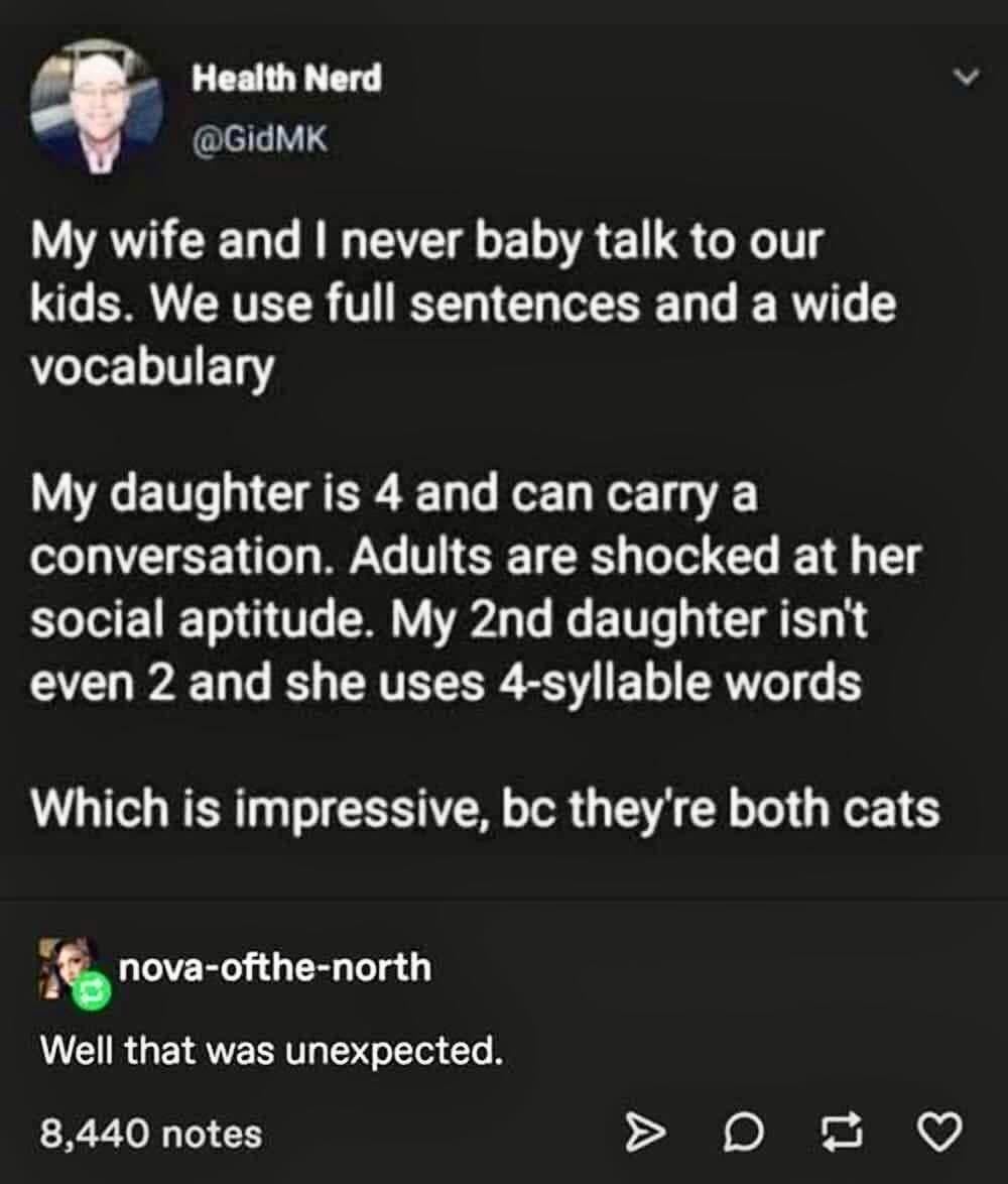 2. What’s so impressive? Cat at 4 is like a 30-32 year old woman. You’d think that she would be able to talk properly. You should actually be concerned about your 2 year old cat. An animal equivalent to a 20+ year old woman should know words with more than 4 syllables. Take her to see a vet.