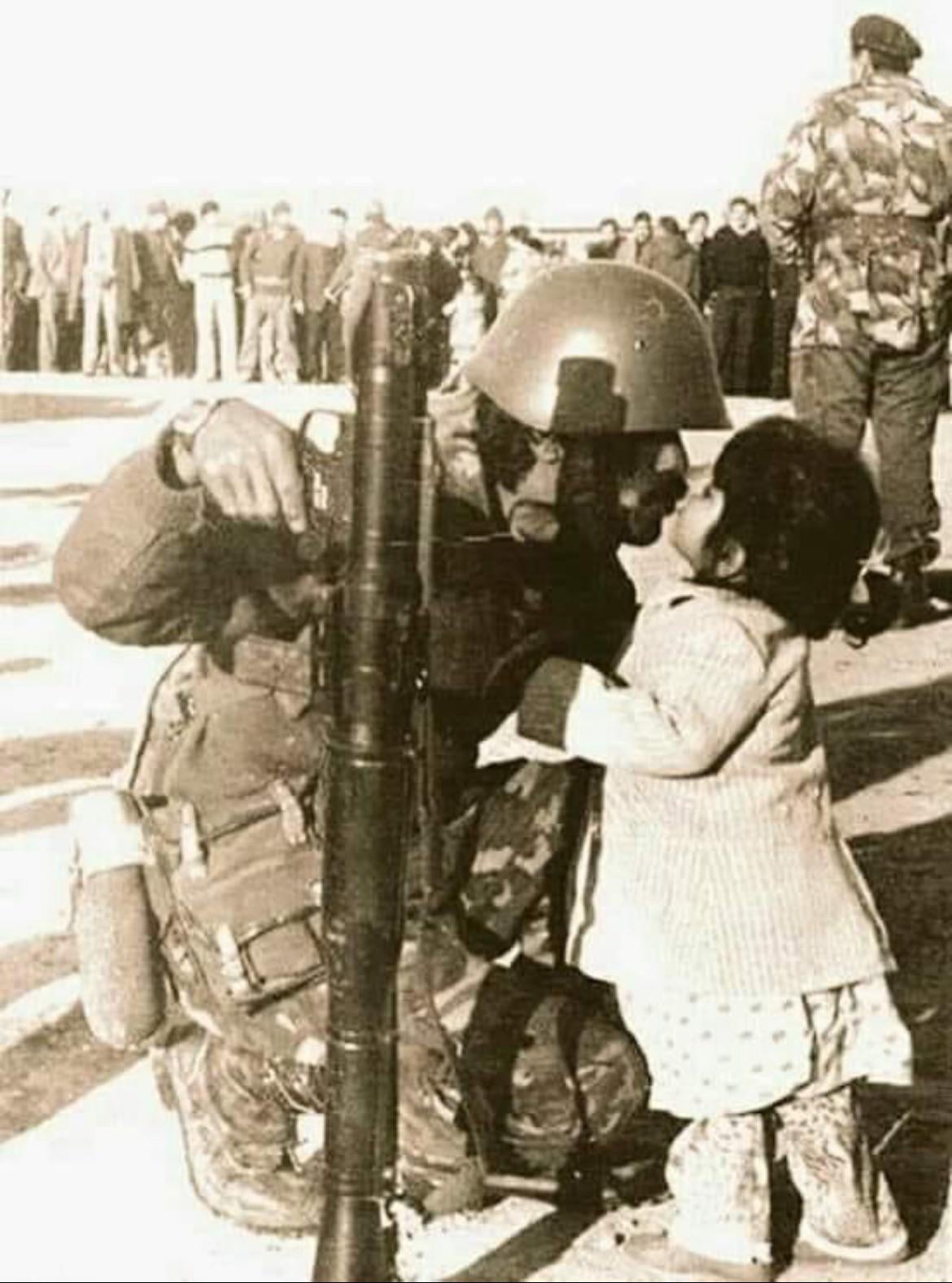 Iraqi soldier kisses his child one last time before heading to the front. Iran- Iraq war,1981. The guy in picture died later during combat.[552×746] by Longjumping_Angle131