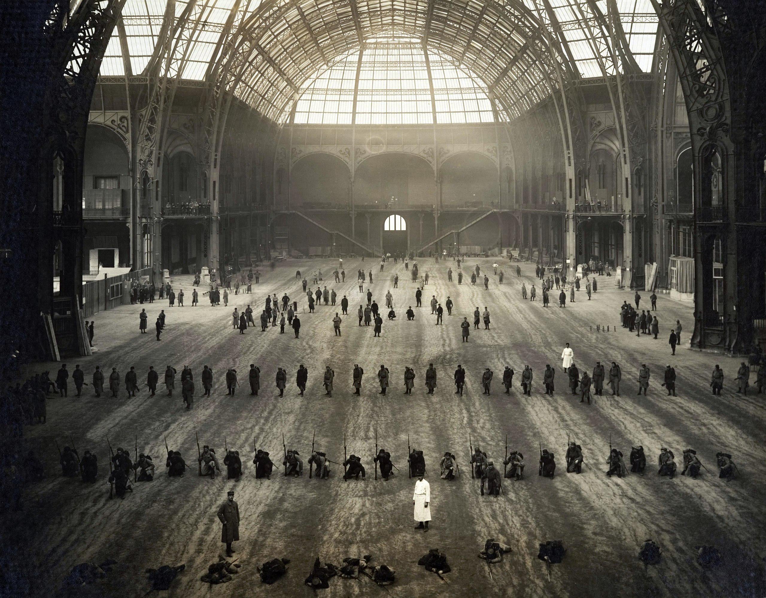 Wounded French soldiers participating in drills inside the Grand Palais to prepare to return to active duty. (1916) [2560×1998] by StephenMcGannon