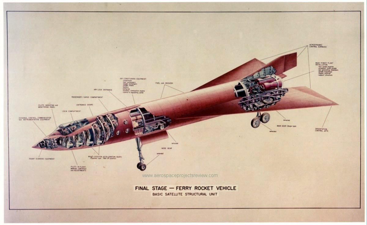 The Ferry Rocket Vehicle – The 3rd stage of the Goodyear Meteor Junior, a proposal by Darrel Romick & others of a fully reusable 3-stage spacecraft, part of developping a “city in space,” a space station with artificial gravity and hangars for spacecraft