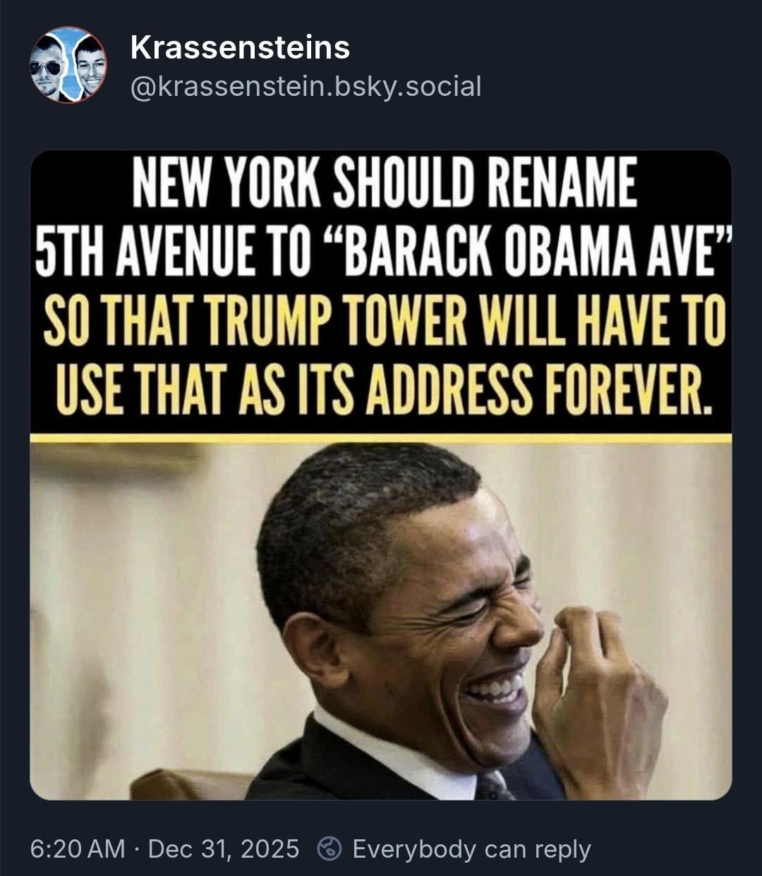 TheNotoriousVIG on December 31, 2025 1:18 pm It’s on a corner so we may as well change the adjacent street as well so it can be on the corner of Barack and Obama😂