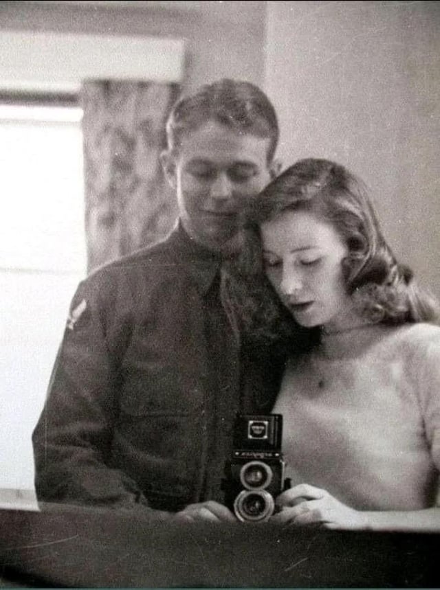 U.S. Army Air Forces 2nd Lieutenant Quentin C. Aanenson takes a mirror selfie with his girlfriend Jacqueline Greer before leaving for Europe, c. March 1944
