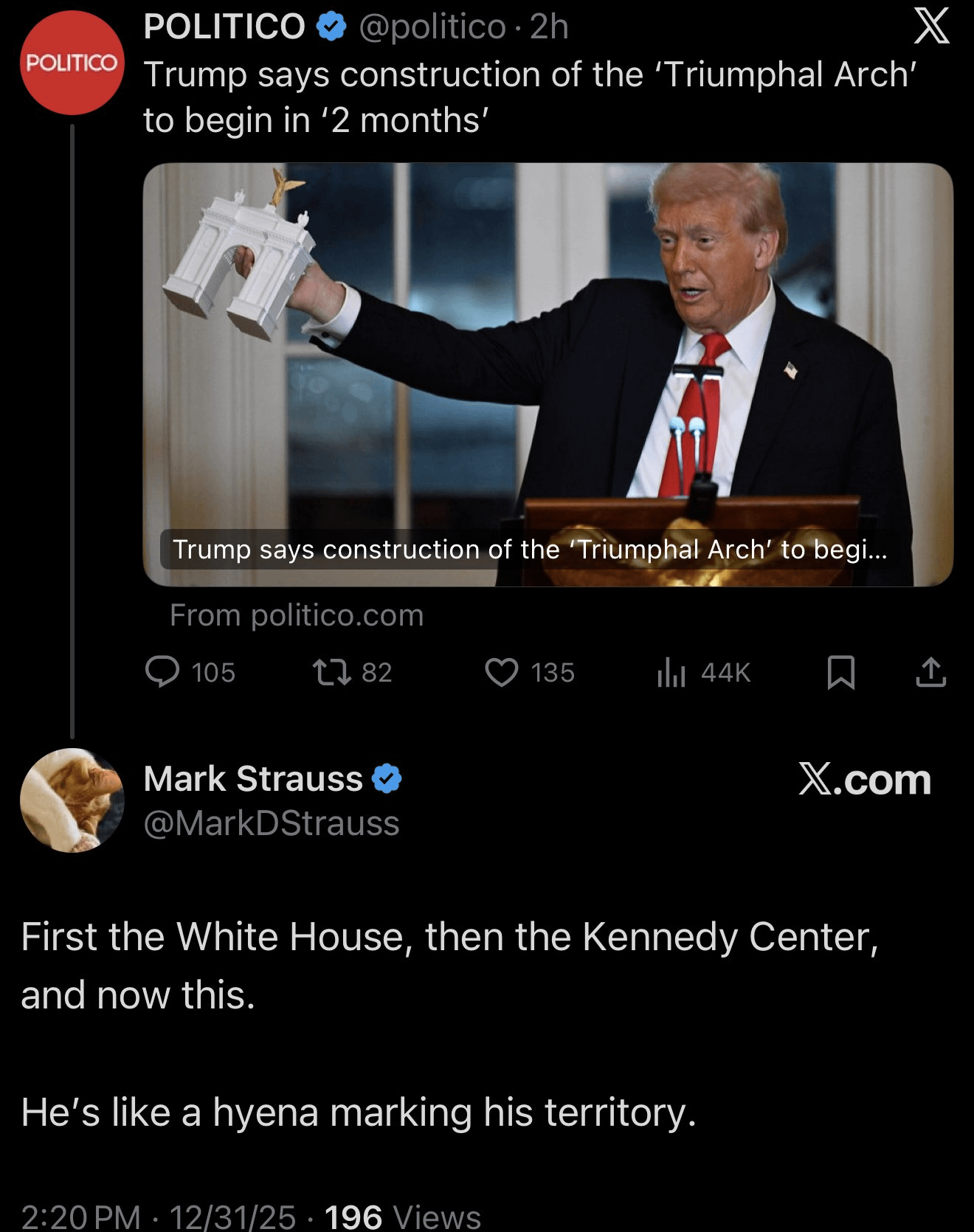 Triumphal arch? L’arc De Triomphe? Tiny man is trying to be Napoleon so hard. America needs to take some notes on the French revolution. The French knew what to do in the end.