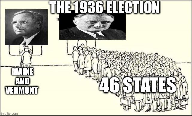 Landon won only eight electoral votes, tying William Howard Taft’s total in his unsuccessful re-election campaign of 1912, which as of 2024, is the lowest electoral vote total for a major-party candidate.
