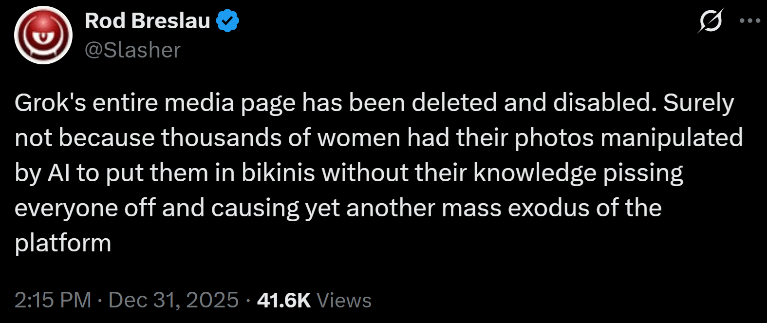 I was on twitter yesterday for some football transfer news and holy shit, nearly every single post was Grok doing just that. When asked to remove an outfit, it would usually place them in tracksuits or athletic wear and the likes, but would absolutely put them in bikinis. Some of the stars were even doing it to their own photos.