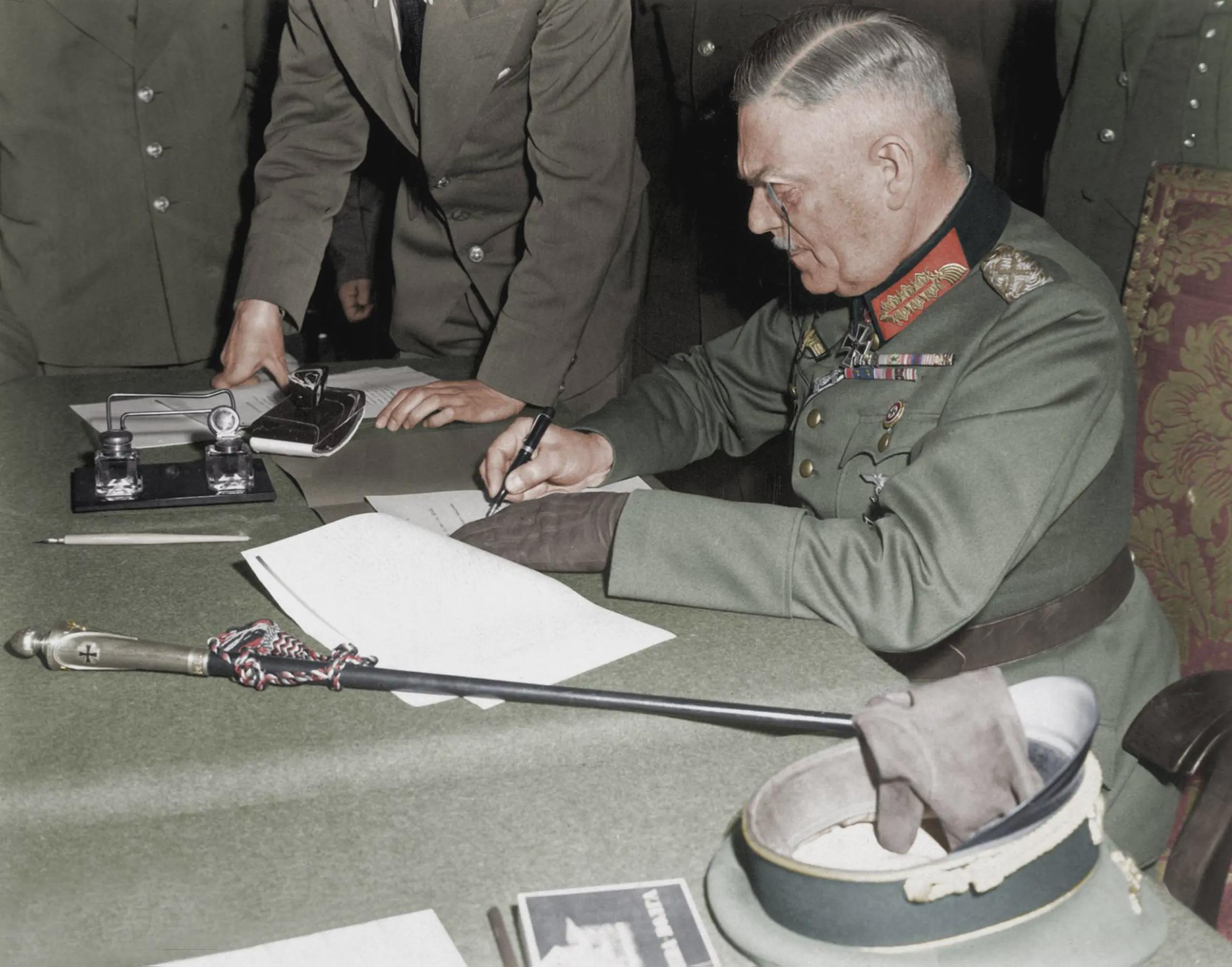 Field Marshal Wilhelm Keitel signing the unconditional surrender of the German Wehrmacht at the Soviet headquarters in Karlshorst, Berlin, during the final days of WWII. The building where this took place is now a museum documenting the WWII German-Soviet conflict. (1945) [2549×2000]
