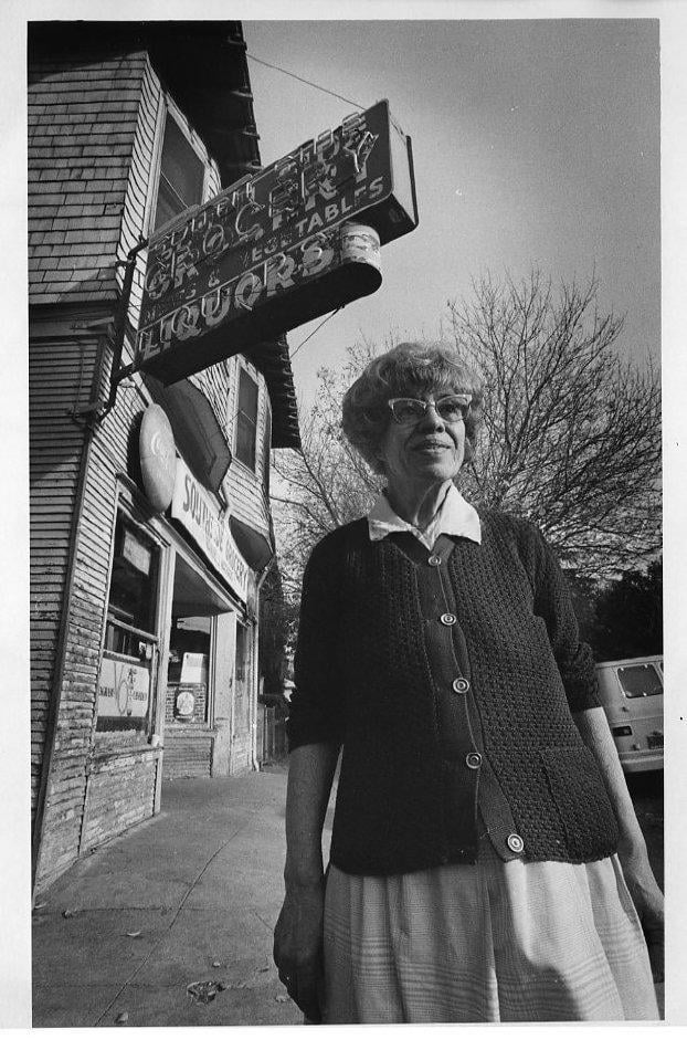 Elsie Machado in front of the store where she worked for sixty years, the South Side Grocery in Sacramento, CA. She spent her last day helping the new owner learn the ropes. (12/01/1977)