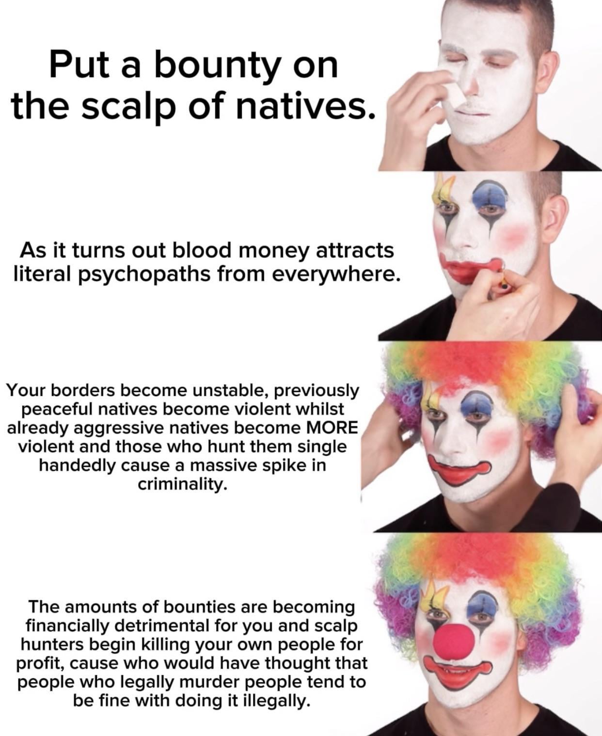 In 1830-1849 many northern Mexican states, mainly Sonora and Chihuahua, established a bounty on the scalps of natives, officially to combat persistent raids by these tribes and secure settler safety. However the main interest seemed to be claiming valuable land, using scalp hunters to eliminate perceived threats and claim territory, often leading to brutal massacres and further conflict as bounties were paid for male, female, and child scalps. It didn’t even matter if it was a tribe that was willing to negotiate with the Mexican government in the past, if it was a native there was a bounty on him/her.