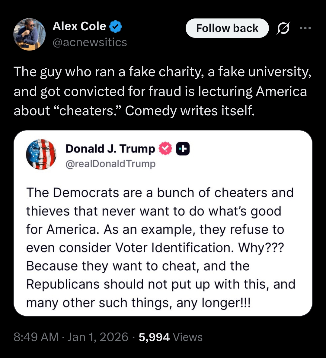 It’s also funny because he made a committee examine voter fraud in his first term (after he won) and they found it was all boomer Republicans trying to vote for him a bunch of times or use their dead spouses name to vote for him.