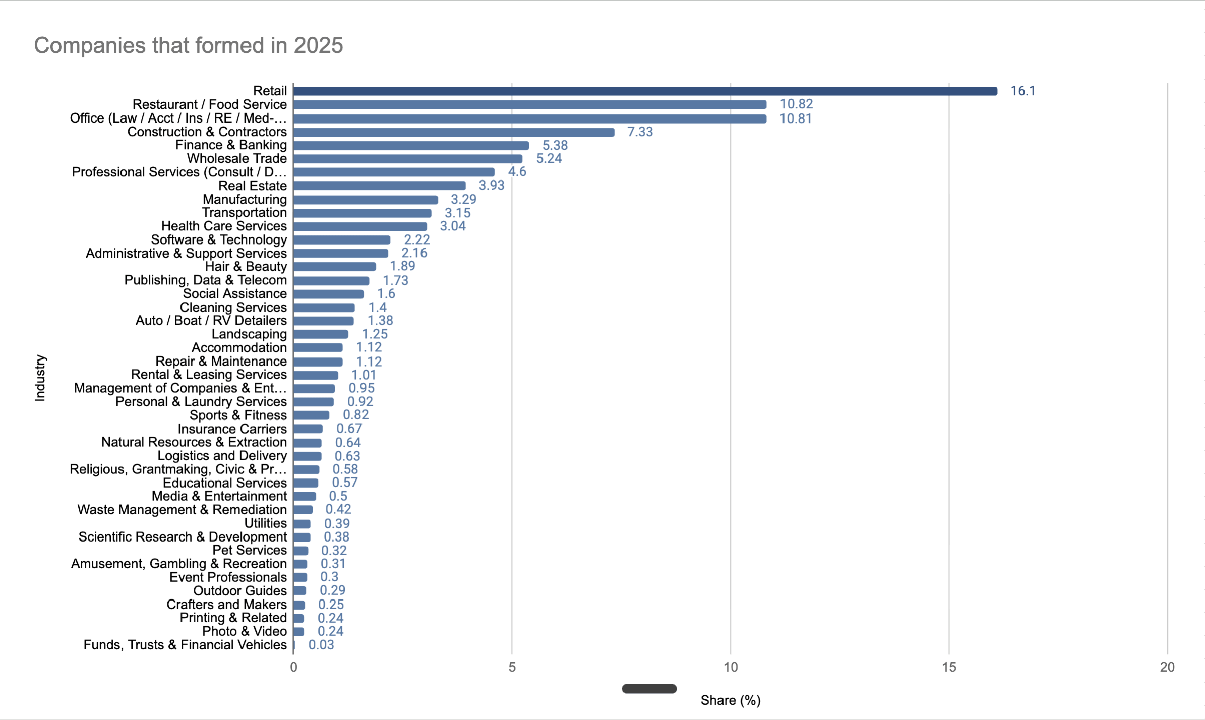 I posted this on a pie chart a couple of days ago and received some constructive criticism, so I changed the visual to a bar chart and created better buckets for the industries.