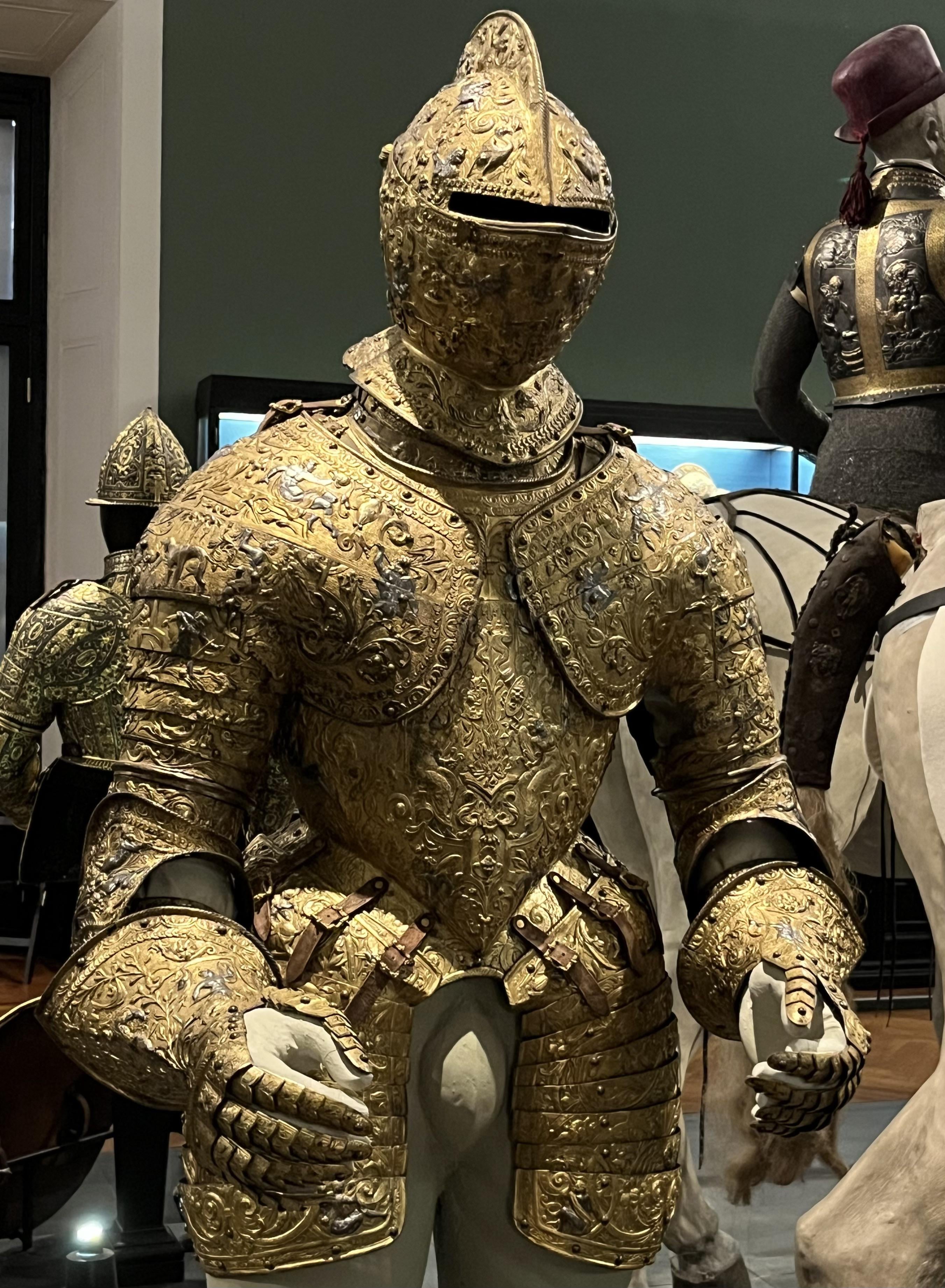 This richly decorated knight’s armor dates from the 16th century, the Renaissance period, and represents parade (ceremonial) armor intended for court ceremonies, tournaments, and public displays of power rather than actual combat. It was made of steel that was subsequently engraved, chased, and partially gilded, featuring lavish floral and ornamental motifs characteristic of Renaissance art, which clearly indicate the high social status of its owner. Such armor was worn by emperors and high nobility, especially within the Habsburg Monarchy, whose capital Vienna was one of the main European centers for the production of weapons and armor, home to master craftsmen of the era. Although it appears heavy and rigid, the armor was custom-made, with articulated joints that allowed movement and horseback riding, but its primary purpose was to symbolize authority, wealth, and military honor, making it both protective equipment and a work of art.