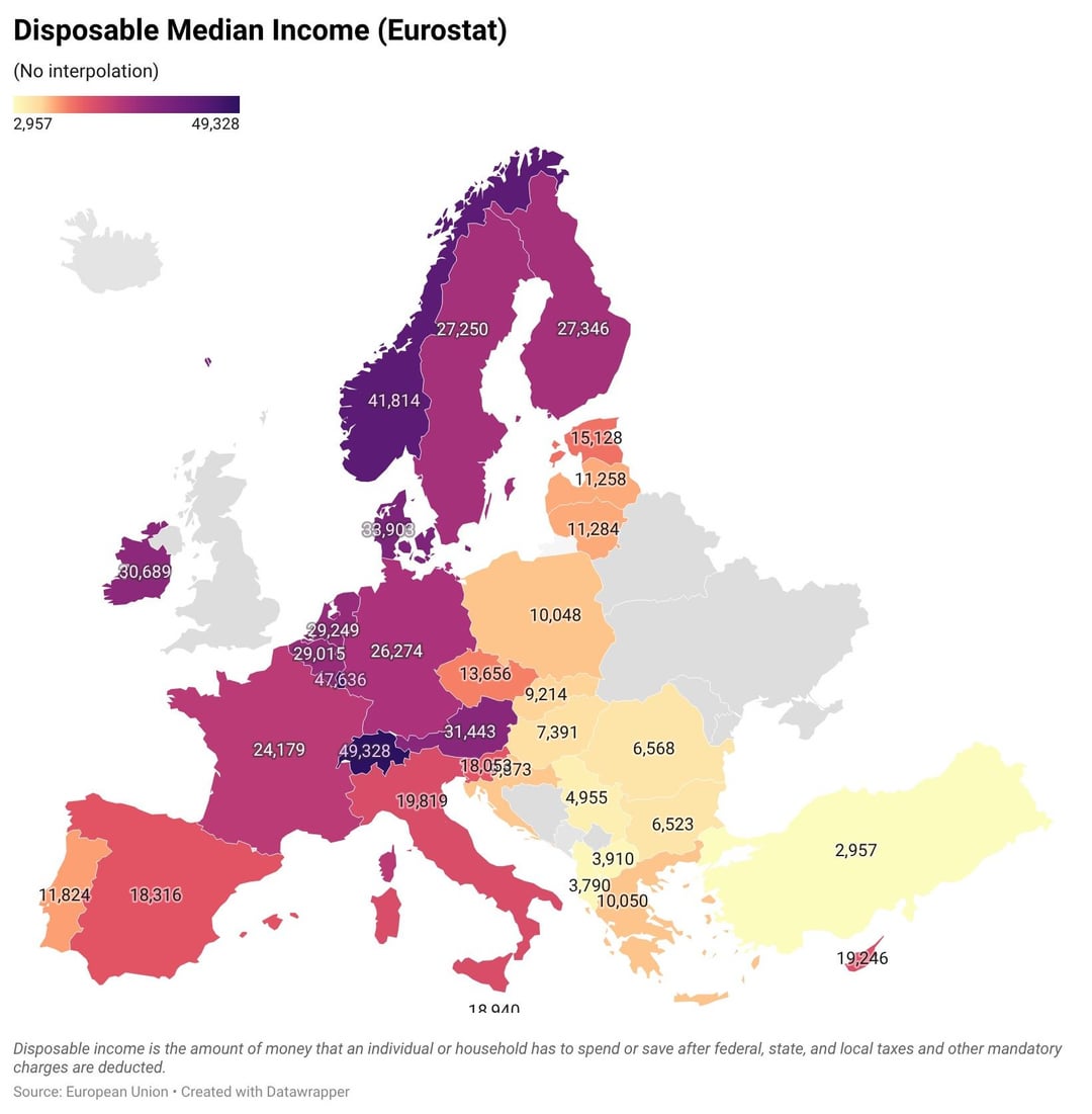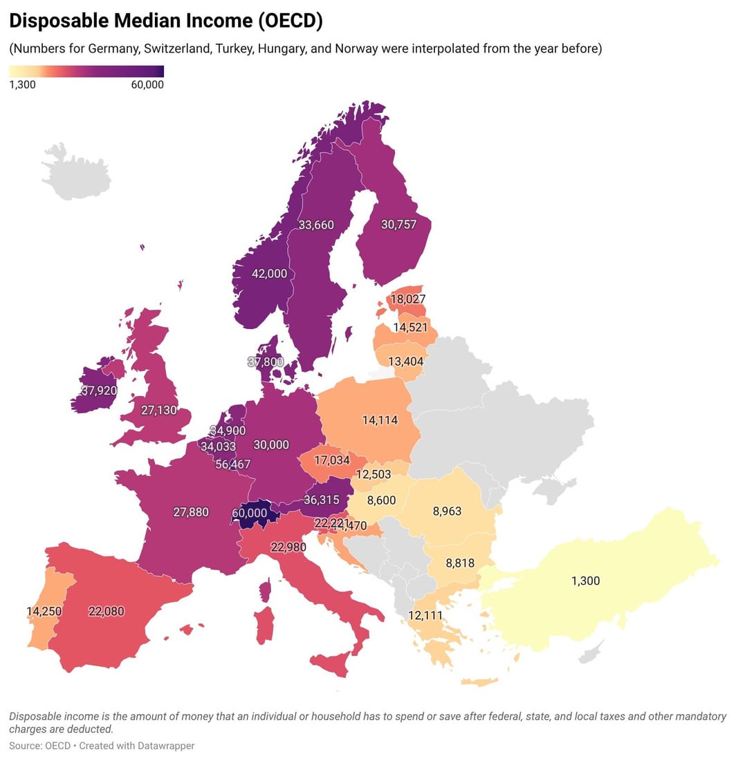 Disposable median income in Europe in different variations