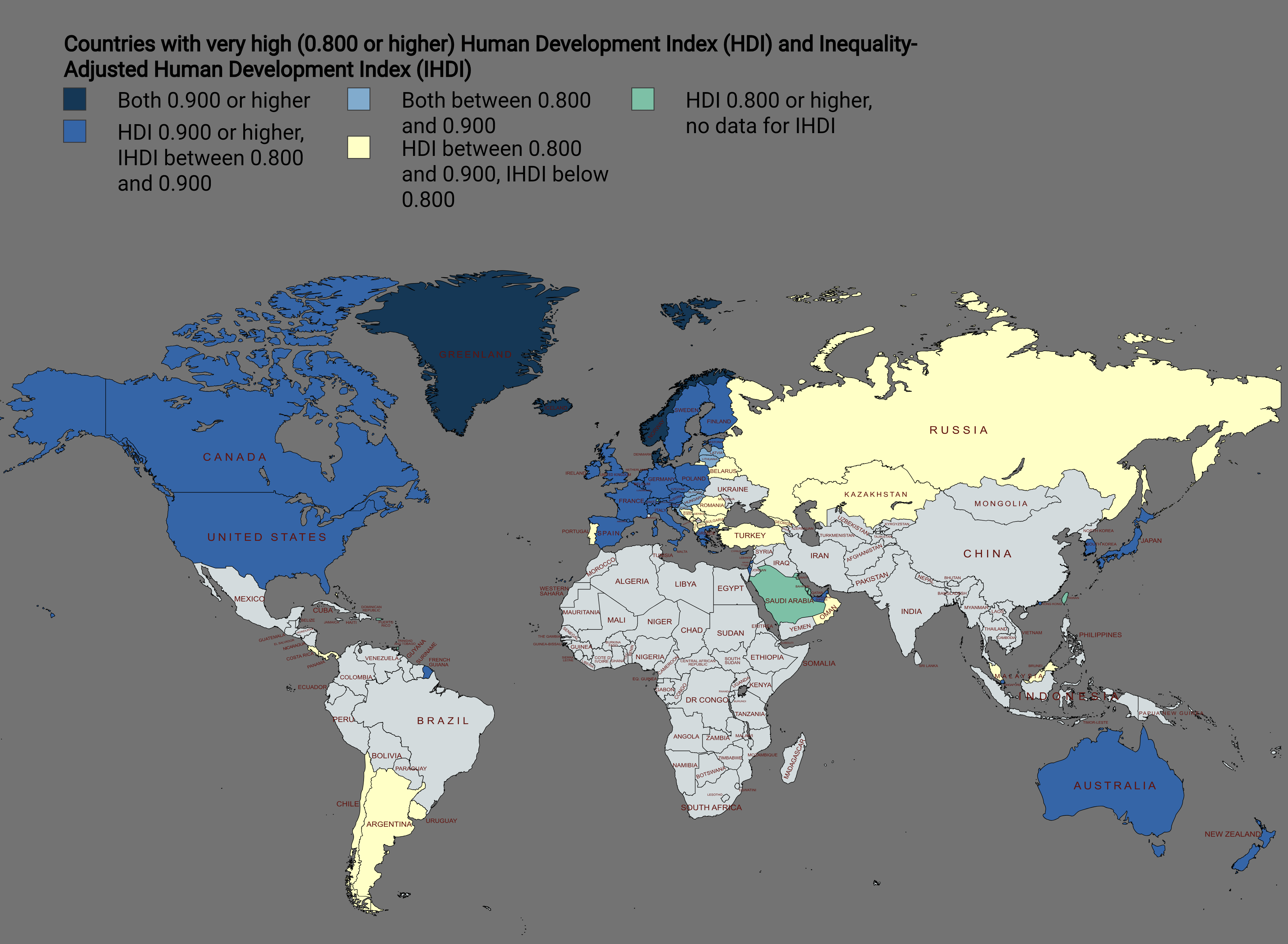 There really should be something in the legend indicating that the gray countries have an HDI below 0.8, since the color choice really makes them look like “no data” despite the fact that all UN member states have an HDI.